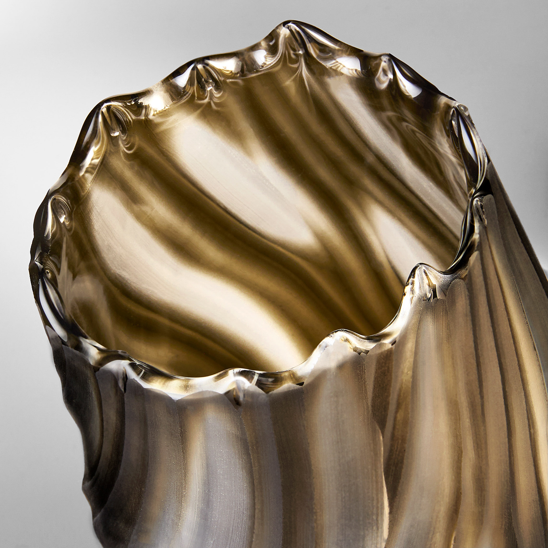 The Seagrass Vase, crafted from art glass with an elegant olive finish, features intricate hand-etched detailing for a unique, textured look. This versatile piece is available in three sizes and adds natural, earthy charm to any space, whether displayed individually or as a grouped set.