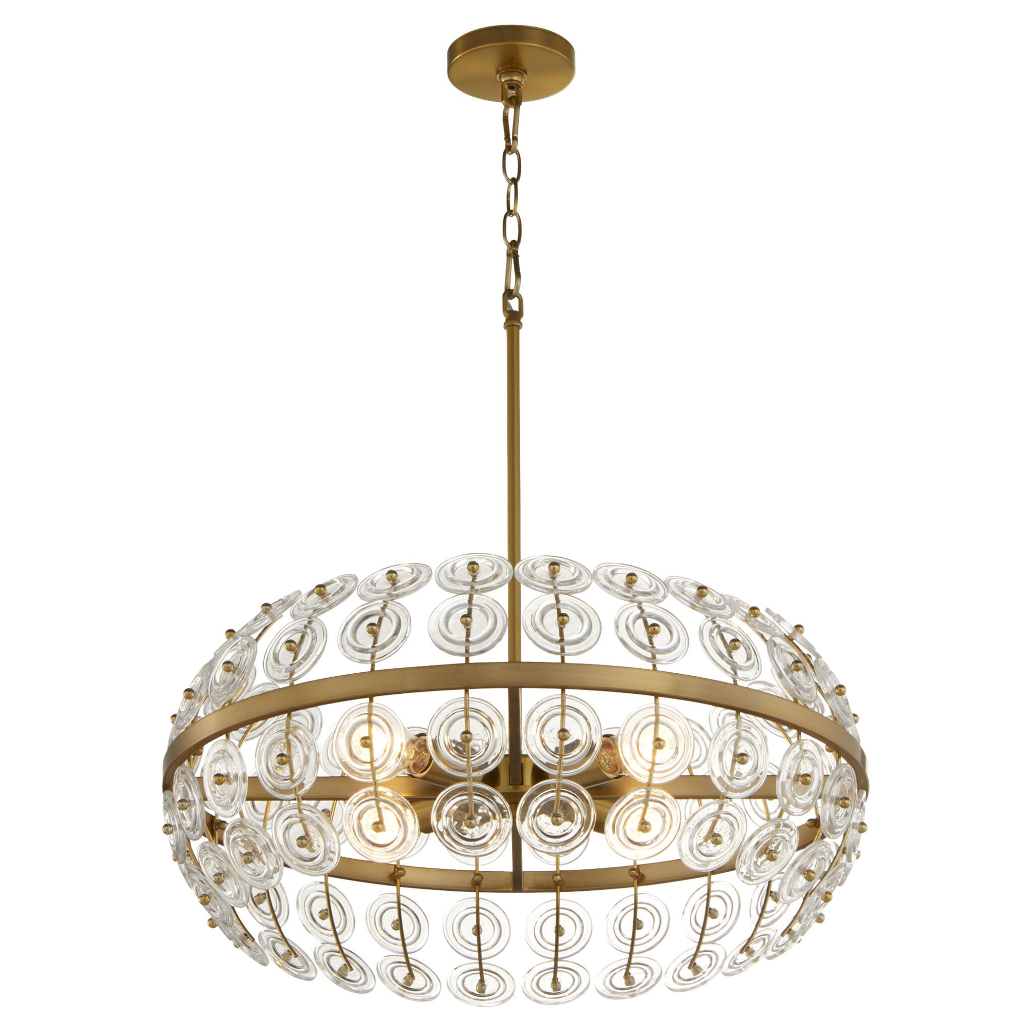 The Selena series of designer lighting is noted for its molded glass disks and elegant matte black or aged brass frames. The shade is cylindrical, with one circular horizontal band with several vertical rods connected reminiscent of a dandelion. Each rod holds a series of clear, concentric, circular molded glass disks with an antiqued ripple design. The medium base sockets are positioned inside the frame, casting a warm glow through the glass discs. The series hangs from a chain attached to a circular canopy.