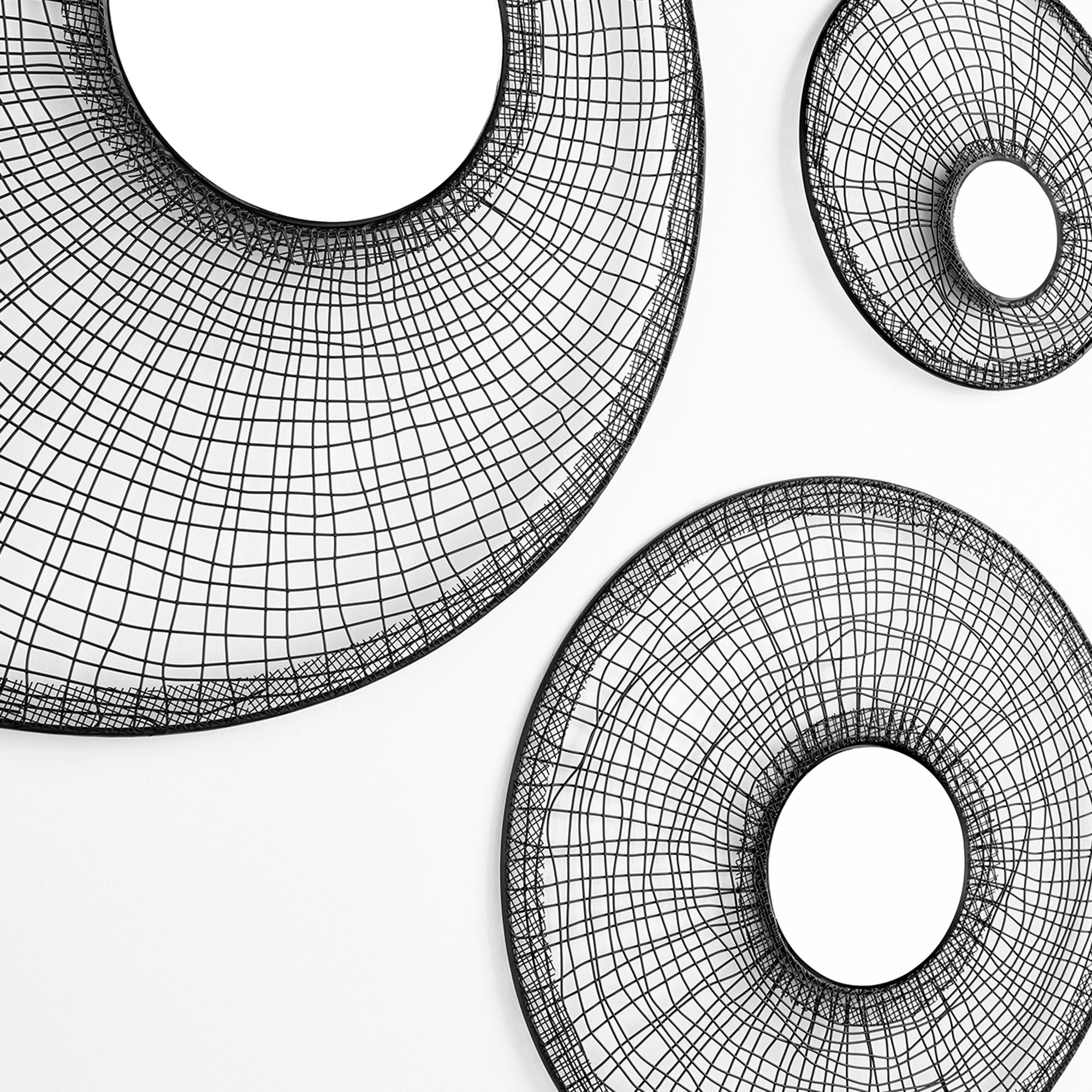 This trio of wall mirrors feature modern crosshatched metal frames in a round graphite finish. The iron metal has wires that are interwoven into one large circle with the reflective glass centered perfectly to provide absolute symmetry. These gorgeous mirrors make an impressive statement showcased together or work just as well hung individually in any home or commercial space.