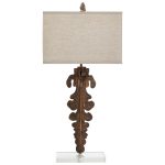 Warm up a traditional space with this elegant wood and iron table lamp. Regal design on its carved base brings an enticing symmetrical emblem, while an off-white shade keeps the motif simple and neutral.