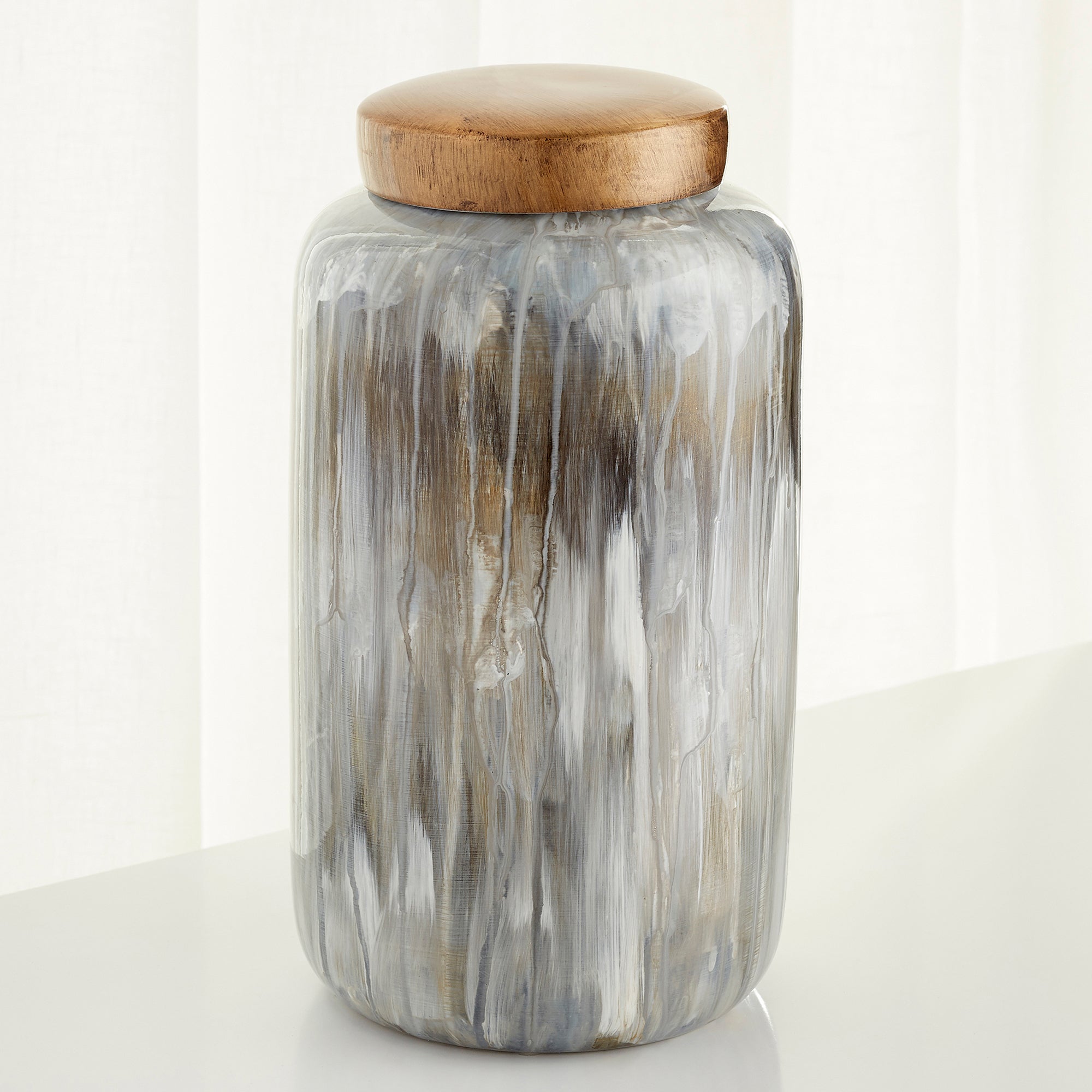One of a collection of three, the Spirit Drip vase features a cookie jar design with a subdued water color effect. The fluid mix of colors features varying hues of grey, white, bronze, and yellow. This porcelain table top piece boasts an eccentric appeal thanks to its design inspired by abstracted landscapes, and an overall organic vibe. Perfect for any tabletop display, in any styles setting, display the complete trio on your living room coffee table, adorn a free floating shelf, or decorate your dining room with this eclectic accent.