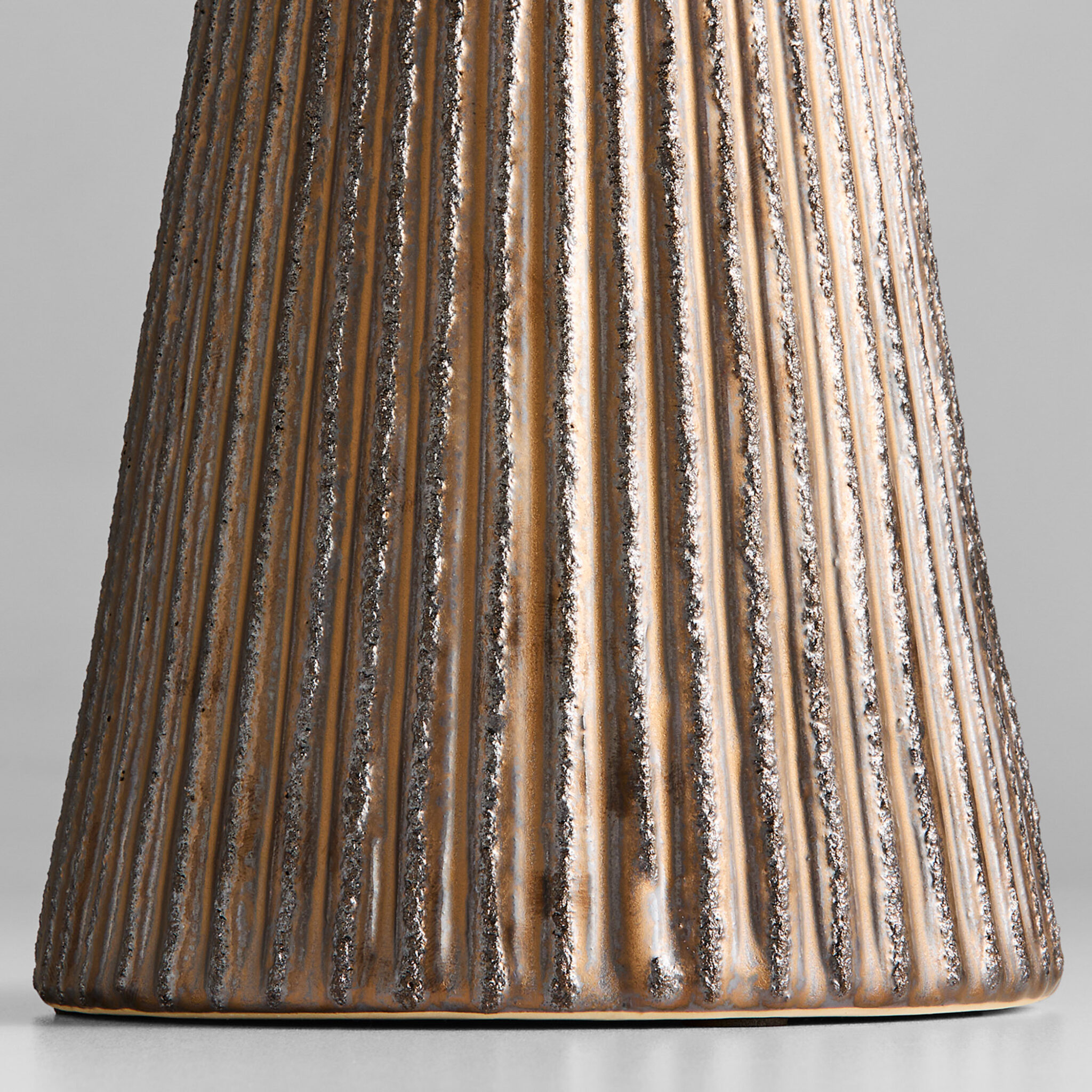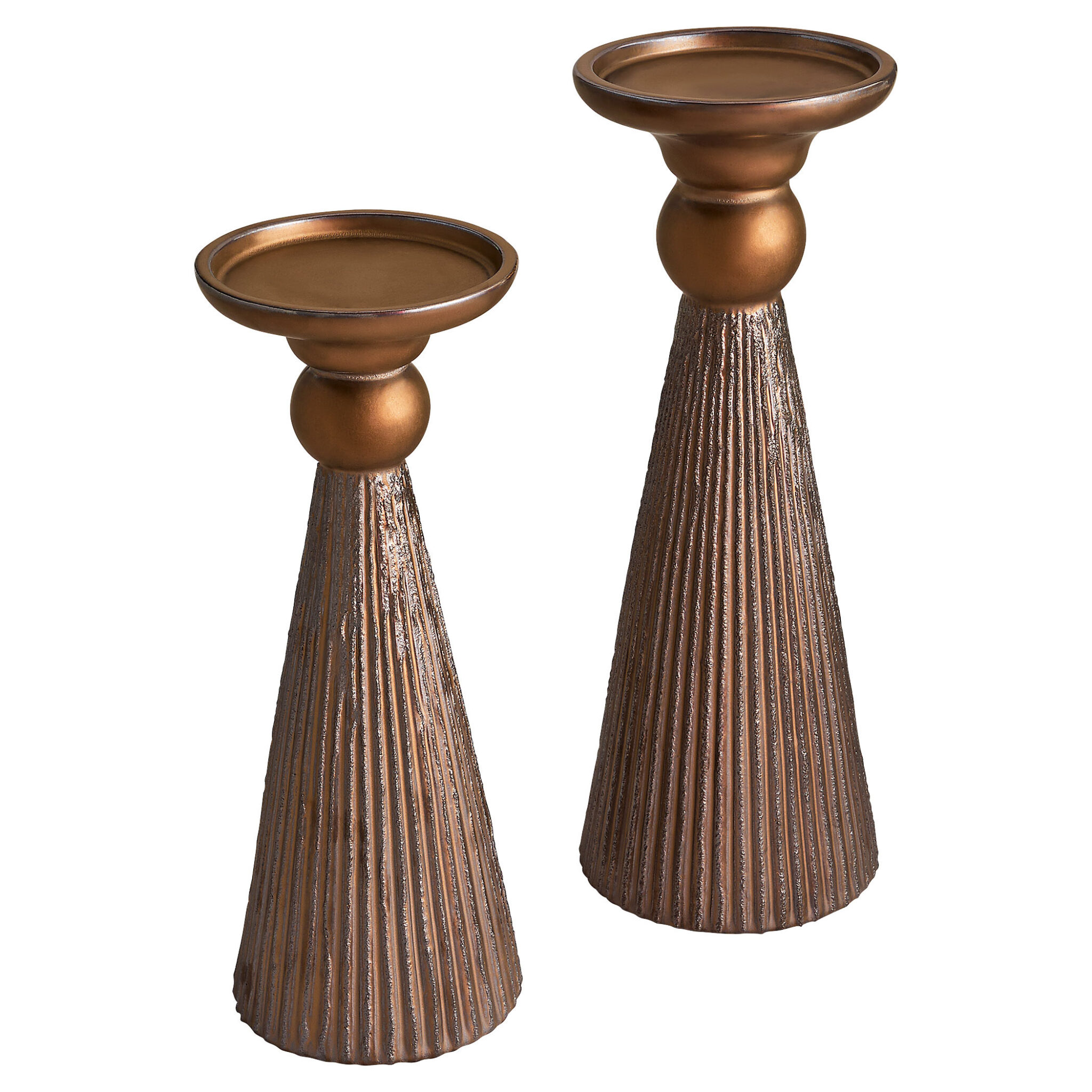 The Starship Candleholders feature a beautifully contrasting, rugged, smooth textured base sculpted from earthenware and finished with a metallic reactive glaze. A geometric sphere between the tapered base and capital adds visual interest. These rustic bronze candleholders are available in two sizes and are perfect for creating a cohesive display.