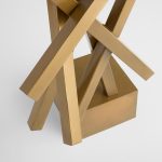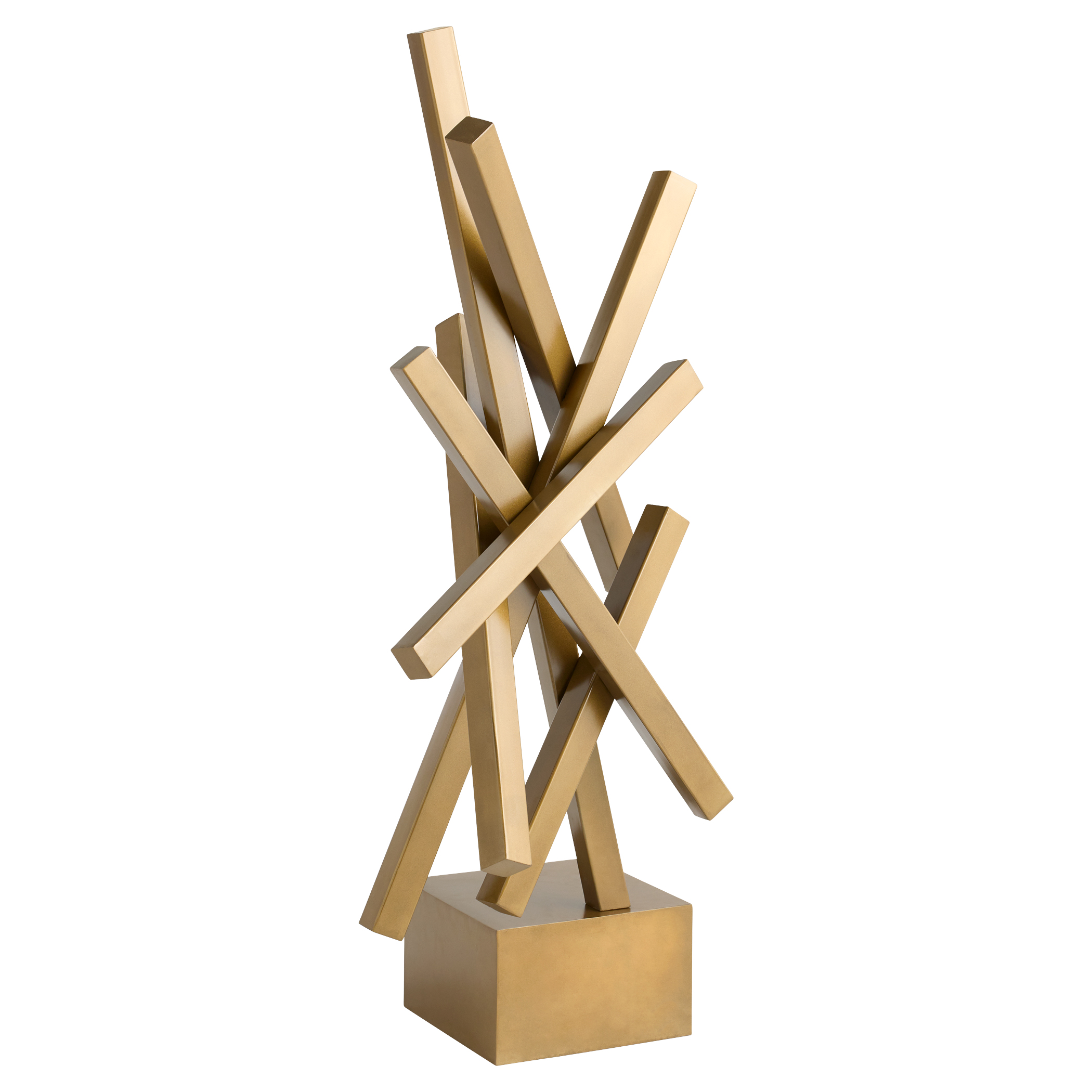 The Stasis Sculpture captures movement in stillness, with seven steel bars seemingly frozen in motion. Their dynamic interaction draws the eye with its bold presence, enhanced by a rich brass finish. This piece is designed on a large scale and captivates attention on a pedestal or display surface.