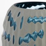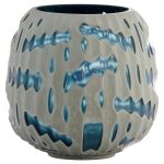 The Strata Vases feature a thick white glass casing that covers a muted blue interior. Skilled artisans meticulously carve a ribbed pattern into the surface, then cut deeper to reveal glimpses of the moody blue hues beneath. The irregular movement of the tribal design makes each piece a true work of art. Available in multiple sizes, they create a striking display when grouped.