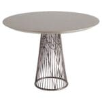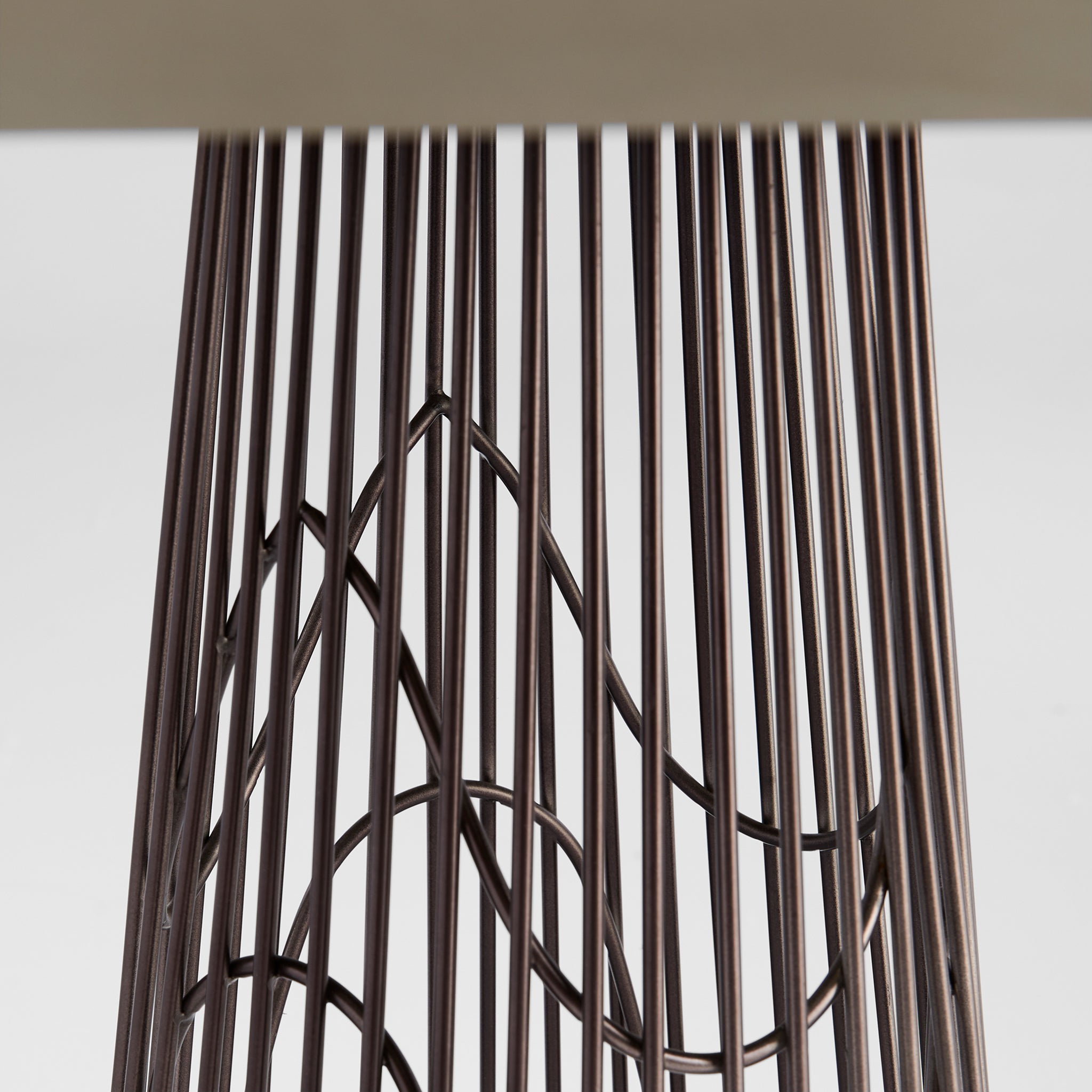 The Suez side table features a base constructed of hand-tooled stainless steel rods, finished in a deep smoked onyx matte. A medium grey laminate applied to Grandis wood reveals intricate grain detail.
