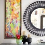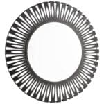 This decorative wall mirror features a modern metal frame in a round graphite finish. The iron metal has accented tabs that are arranged side by side into one large circle with the reflective glass centered perfectly to provide absolute symmetry. This gorgeous mirror makes an impressive statement showcased in multiples or works just as well hung individually in any home or commercial space.