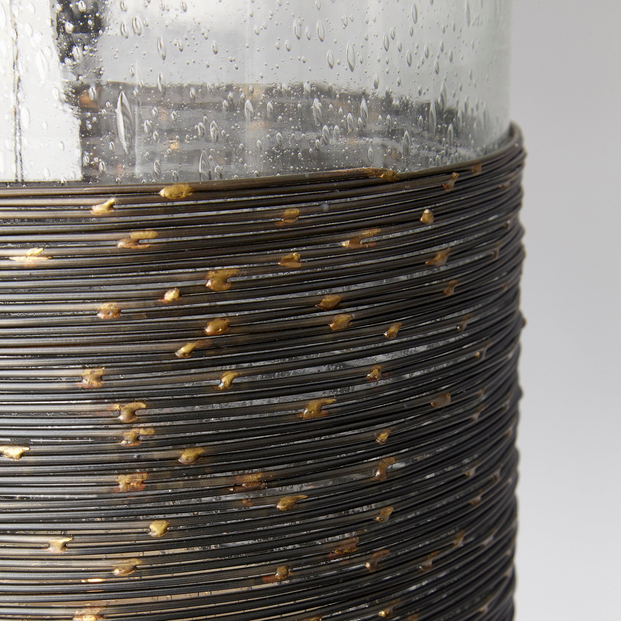 Gorgeous glass is wrapped in antique black finish metal to create a compelling combination for this large metal candleholder. Spruce up a cocktail table or bring an inviting glow to an entryway.