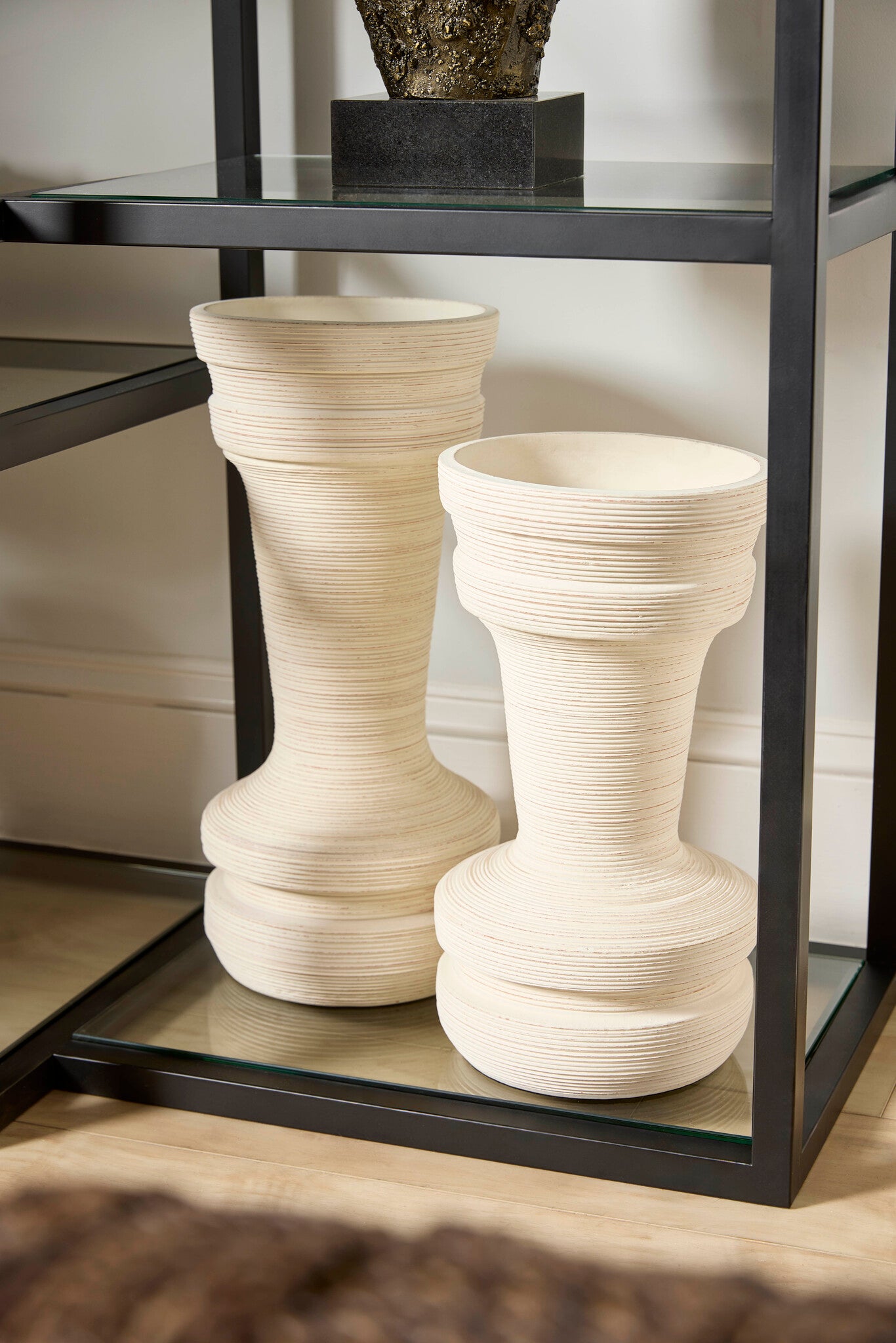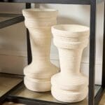 Heavily textured by intricately applied horizontal striations, the Taras vases of off-white earthenware vases are artisanally constructed with an inventive spirit. A classic begonia contour gives the collection a dramatic aesthetic by captivating awareness through form and hand-raked texture that is balanced by a neutral finish with clay undertones. Enhance a covered patio, dining area or entryway with the Taras collection. Available in three sizes. Not water-tight.