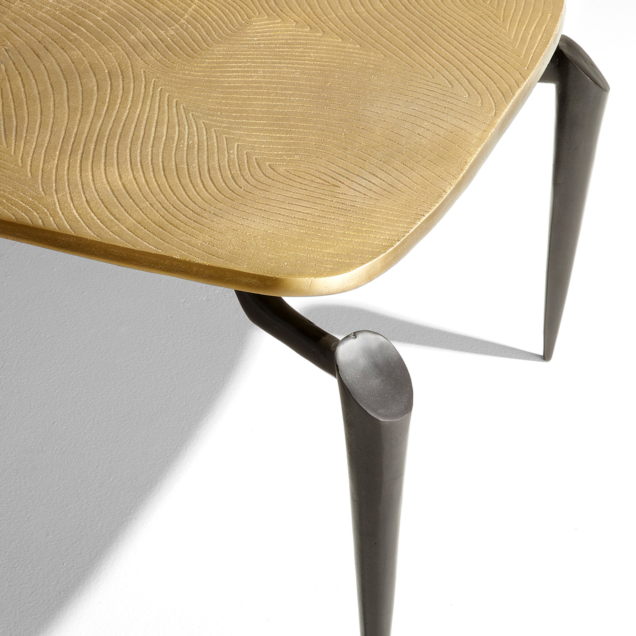 The Tarsal table collection is as anomalous sounding as it looks. Its spiny matte black legs imbue it with an outer-worldly appearance that is both utilitarian and sculptural at the same time. Its large aged brass finished aluminum tabletop surface is durable and contrastingly curvy with a unique texture.