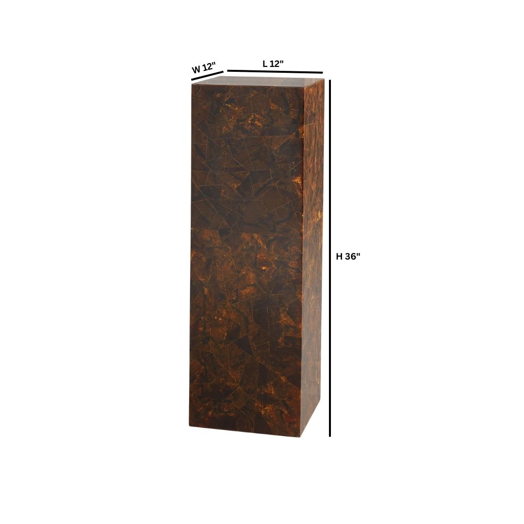The Taurus pedestal is hand-cut and assembled from a mosaic of faux brown horn shapes and sizes that join together like puzzle pieces to create a dramatic veneer. Each piece contains a unique variation in color that is intrinsic to the material. This captivating pedestal is neutral in tone and can adapt to many living areas. Display your favorite sculpture on top of the Taurus pedestal in an entryway, office or lobby. Available in two sizes.