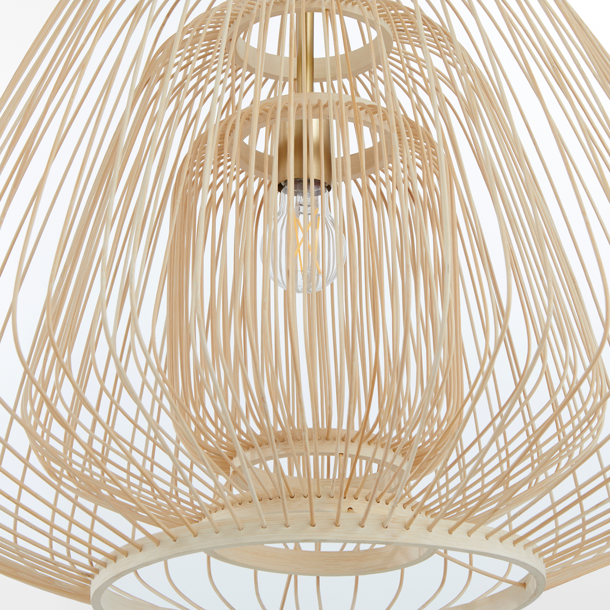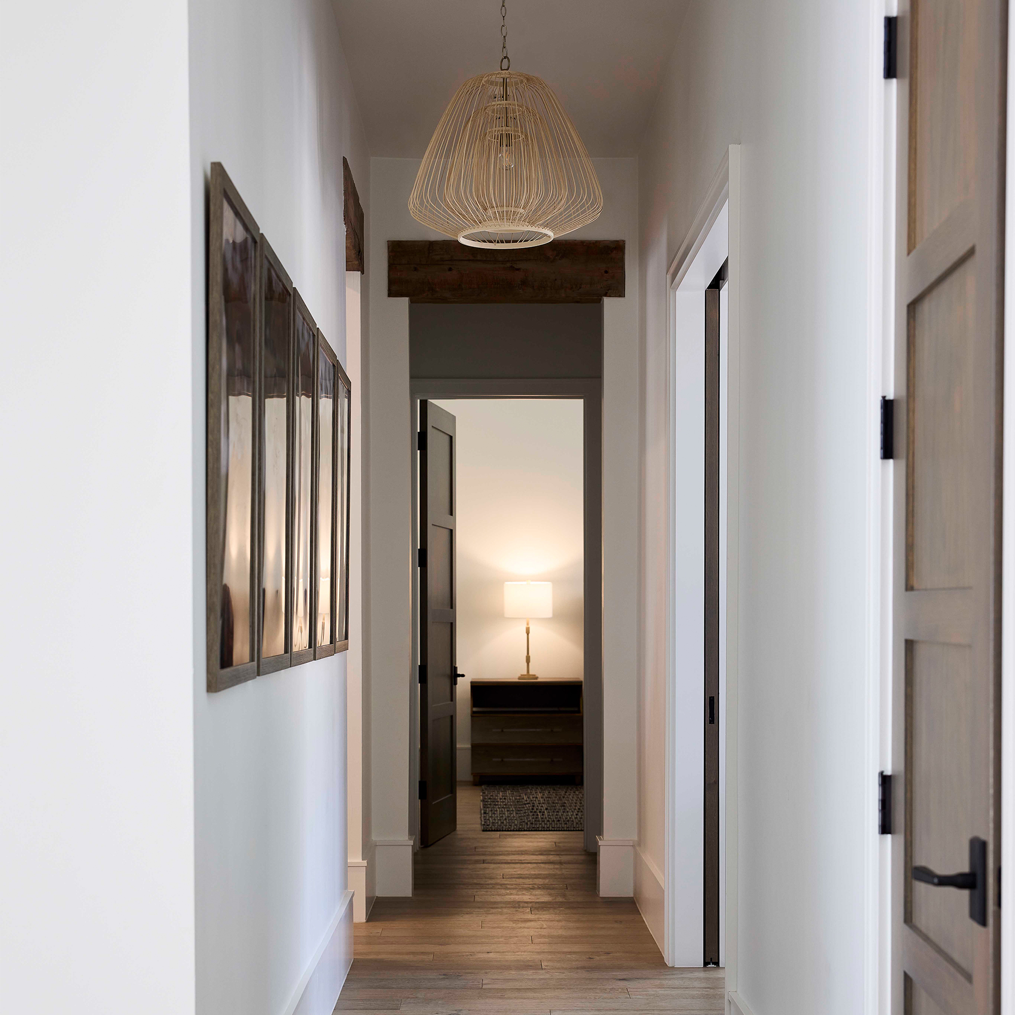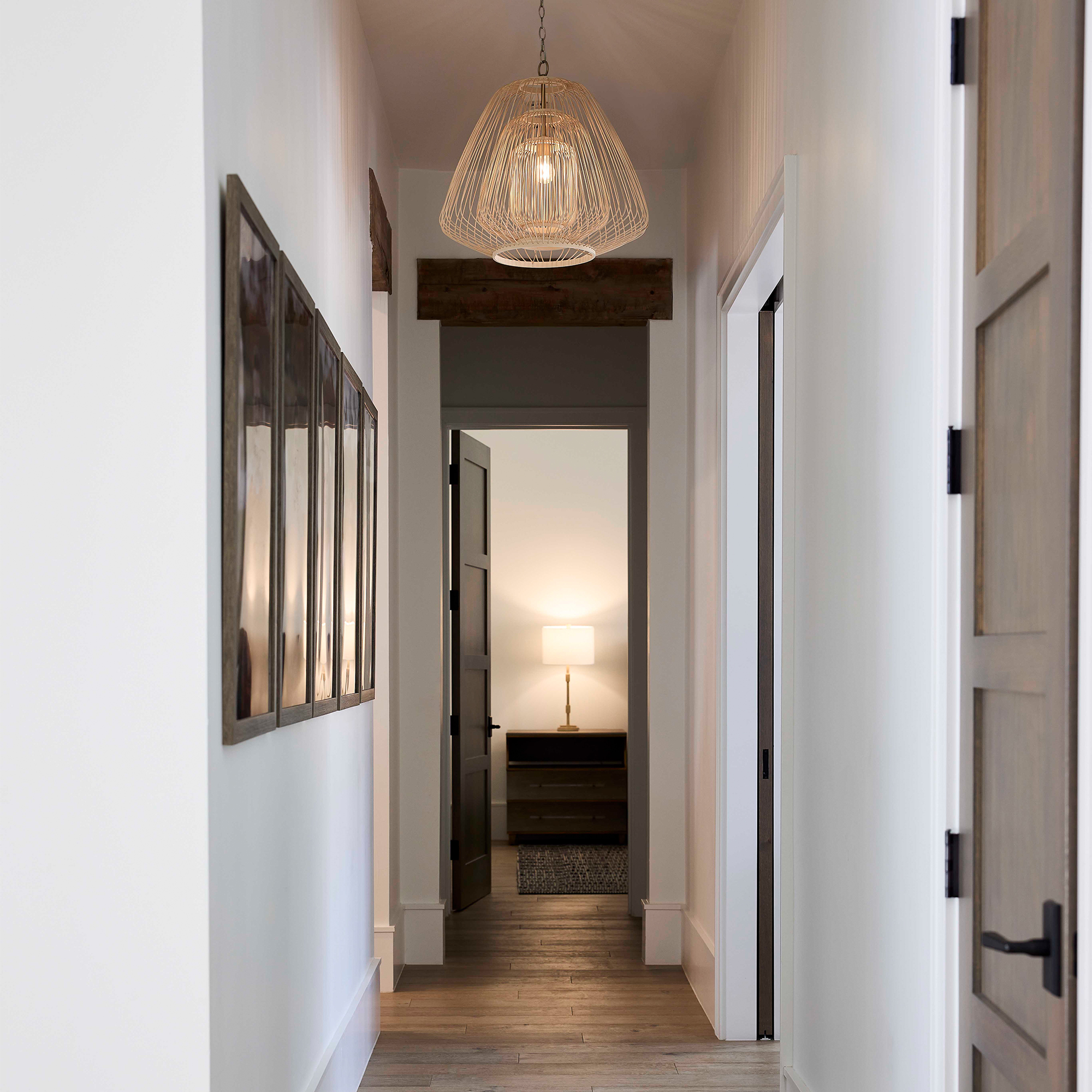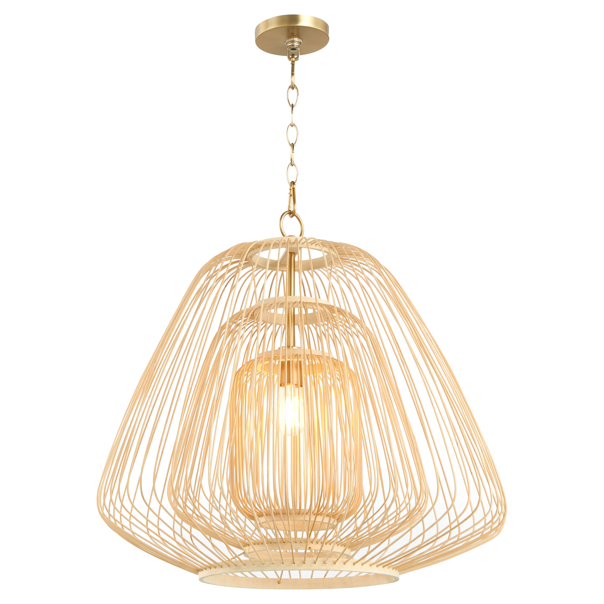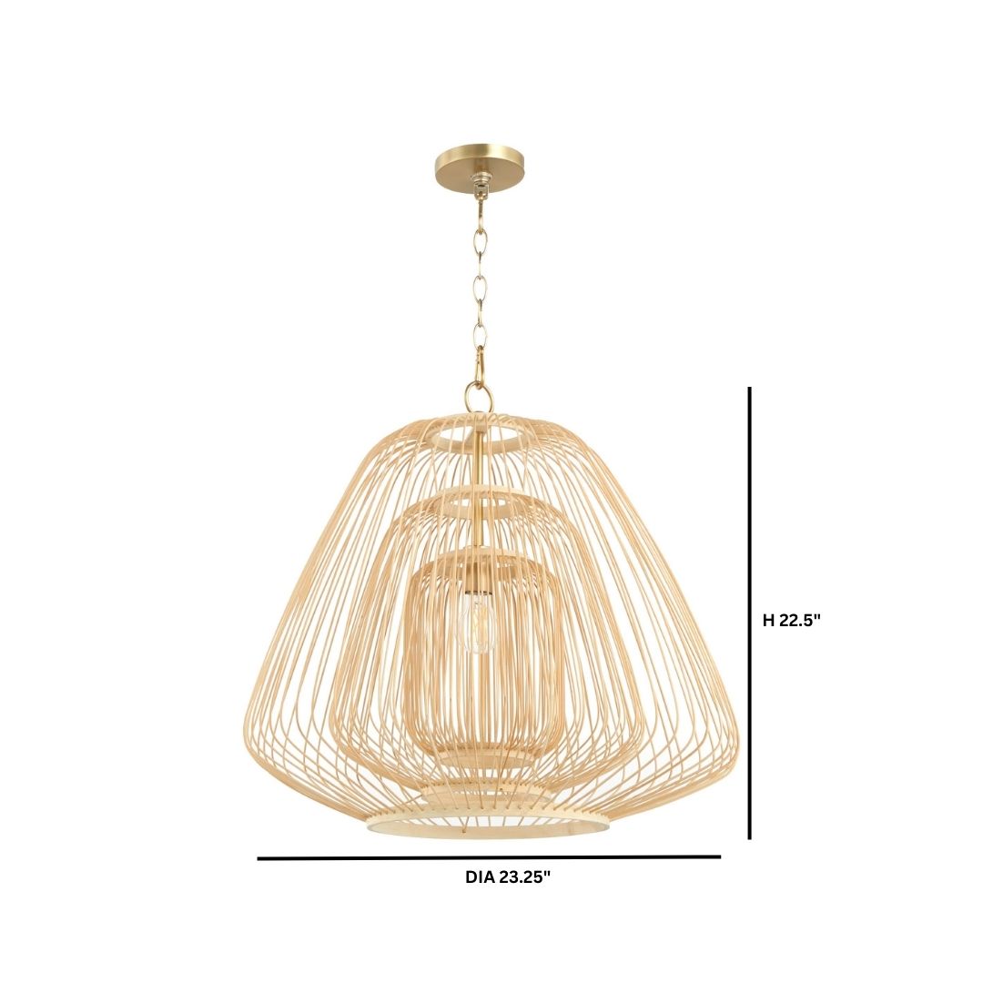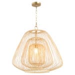 Crafted from stripped rattan and suspended with an aged brass decorative rectangle link chain, the Terrae Lighting Collection exudes a sense of organic beauty and understated luxury. The design’s dimensionality adds depth and visual interest, creating a captivating focal point with three layers of concentric shapes that add texture and complexity. With options of round, triangular, or bell-shaped shades, the Terrae pendants offer versatility and luminosity through one 60-watt socket.