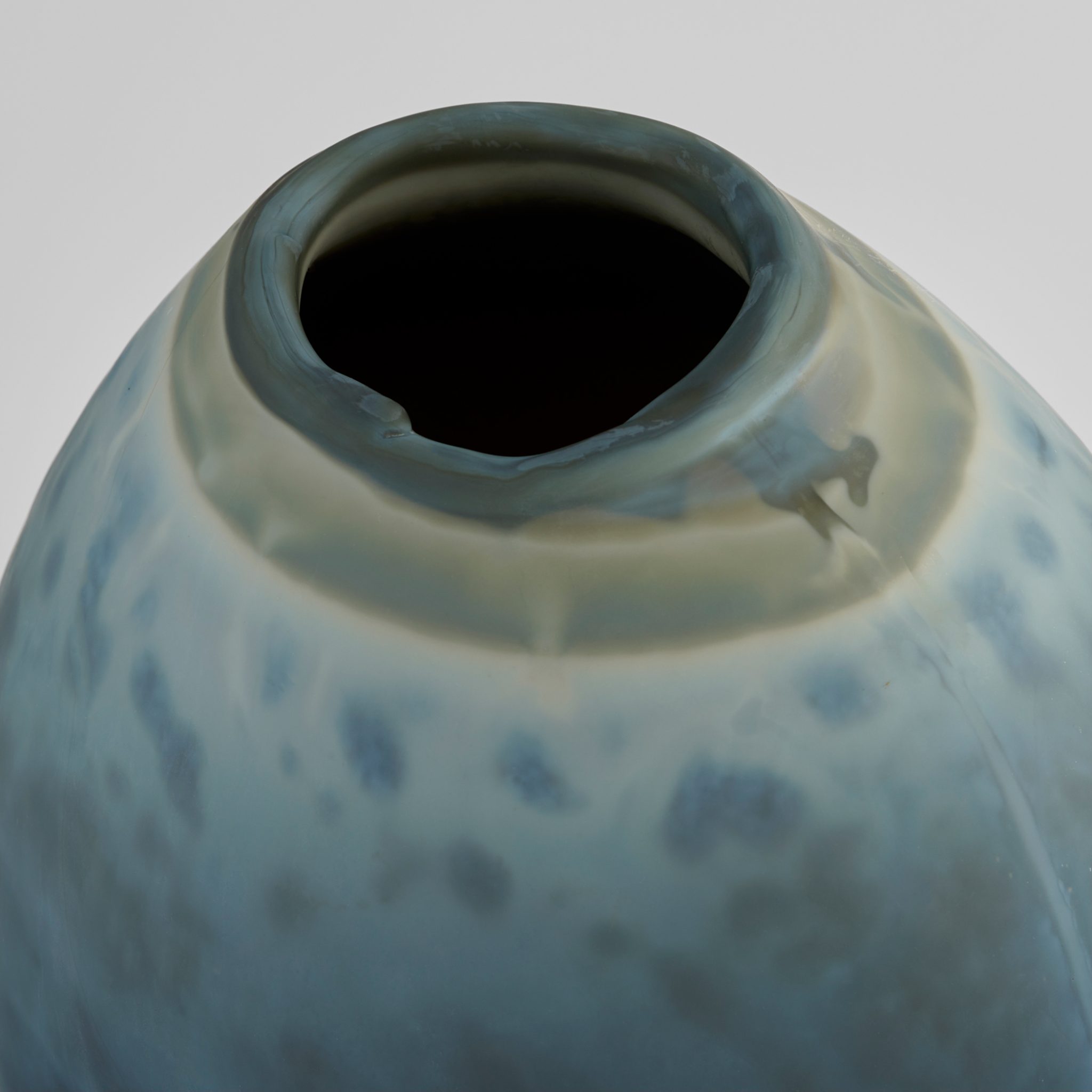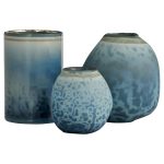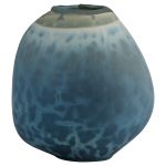 The Tiedye Vases are captivated by their standout design. A reactive glaze interacts with the blue tones on the vases, creating unique patterns shaped by temperature and form. Crafted from cased glass, each piece is a distinctive blend of color and composition.