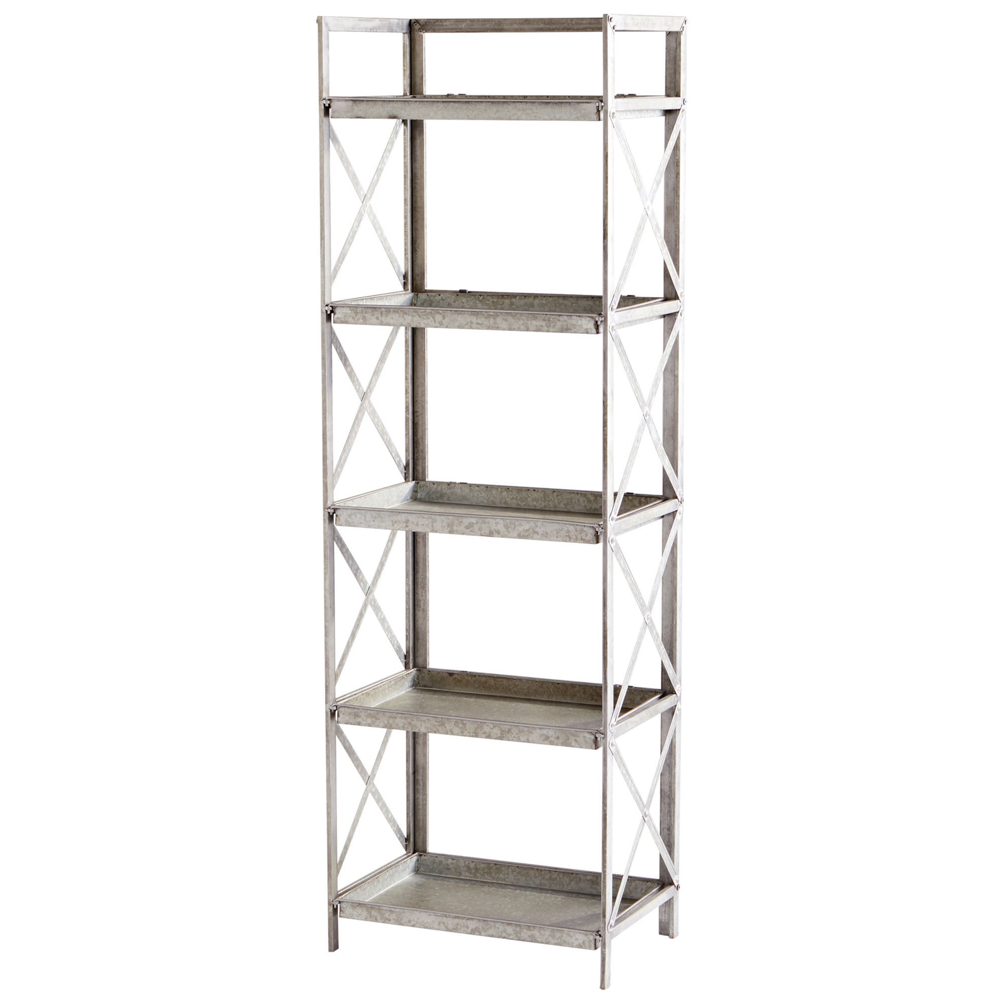 Elongated and stunning, this galvanized metal etagere is a great complement in any living room or dining room. Crossed lines add dimension, while the slightly muted color ensures a modern aesthetic match.