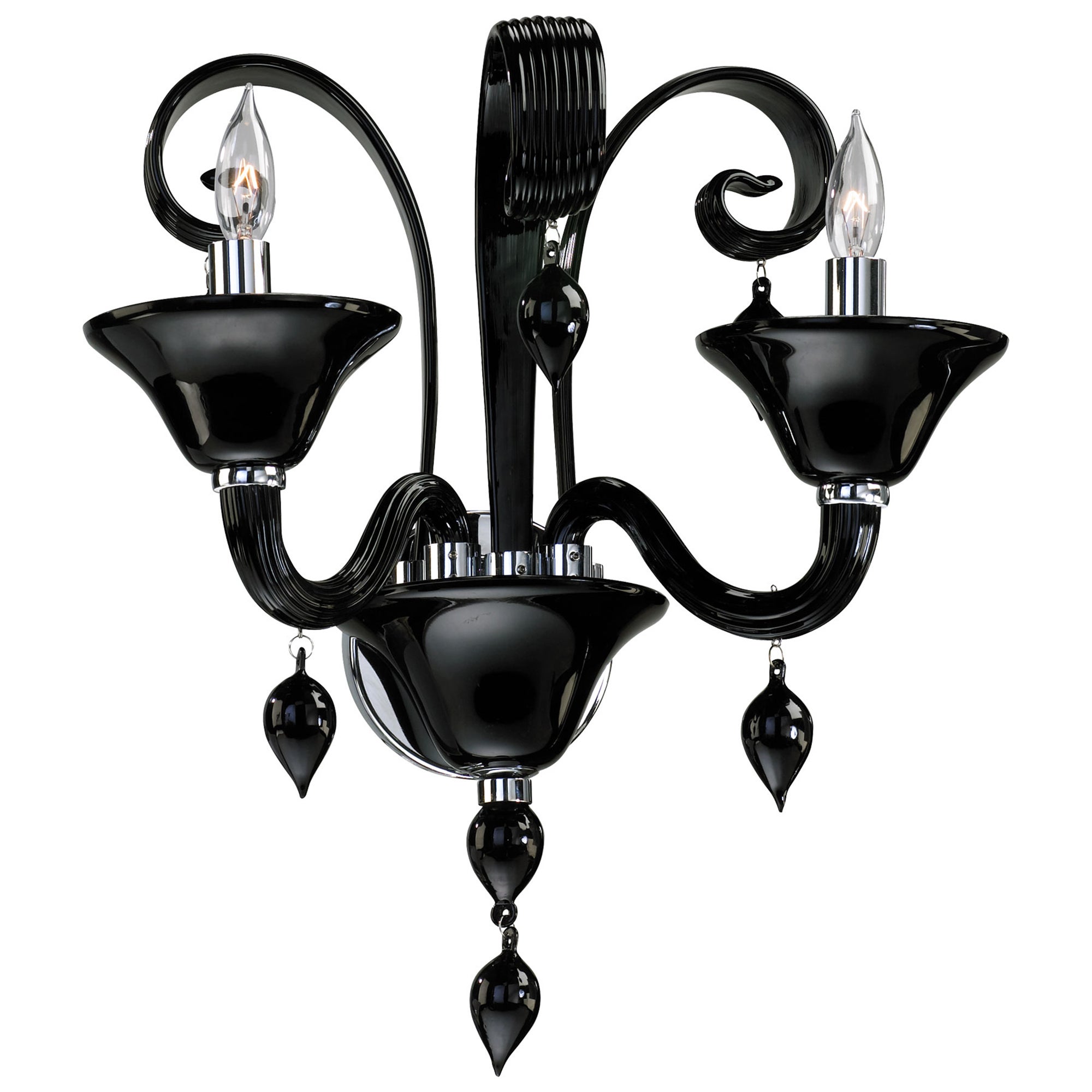 Richly dramatic, Murano-style black glass is a superb choice for this elegant two-light chrome wall sconce. Crafted in iron and glass, the Treviso collection fixture features scroll-inspired petals with curvy candelabra-style arms. Bring ambient illumination and dramatic style with this gorgeous sconce.