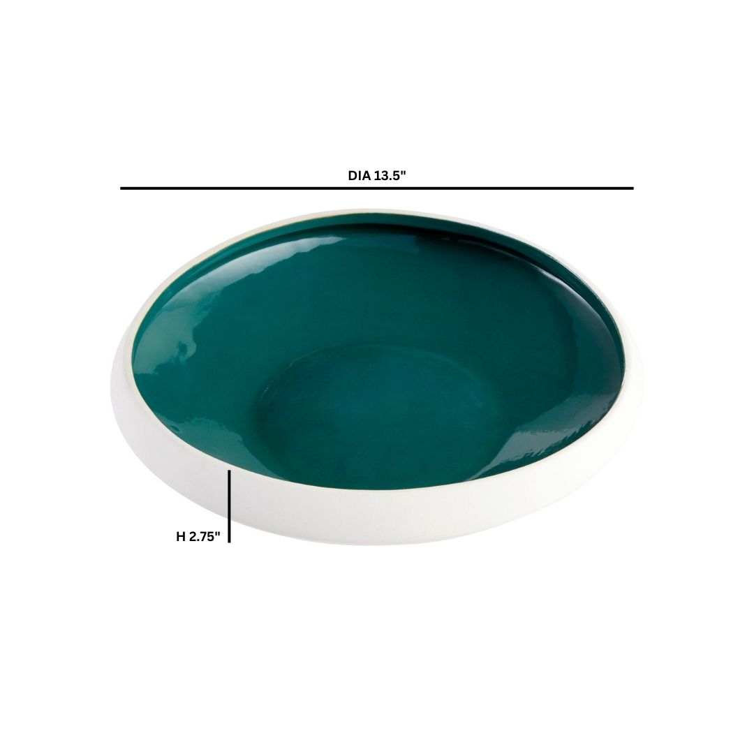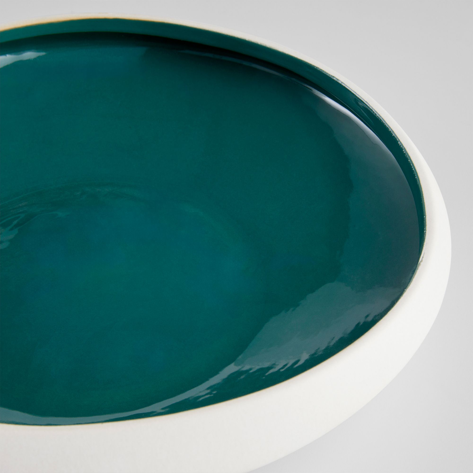 • Low Nesting Bowl | Textured Matte White Exterior | Green Glazed Interior | Round With Asymmetrical Rim