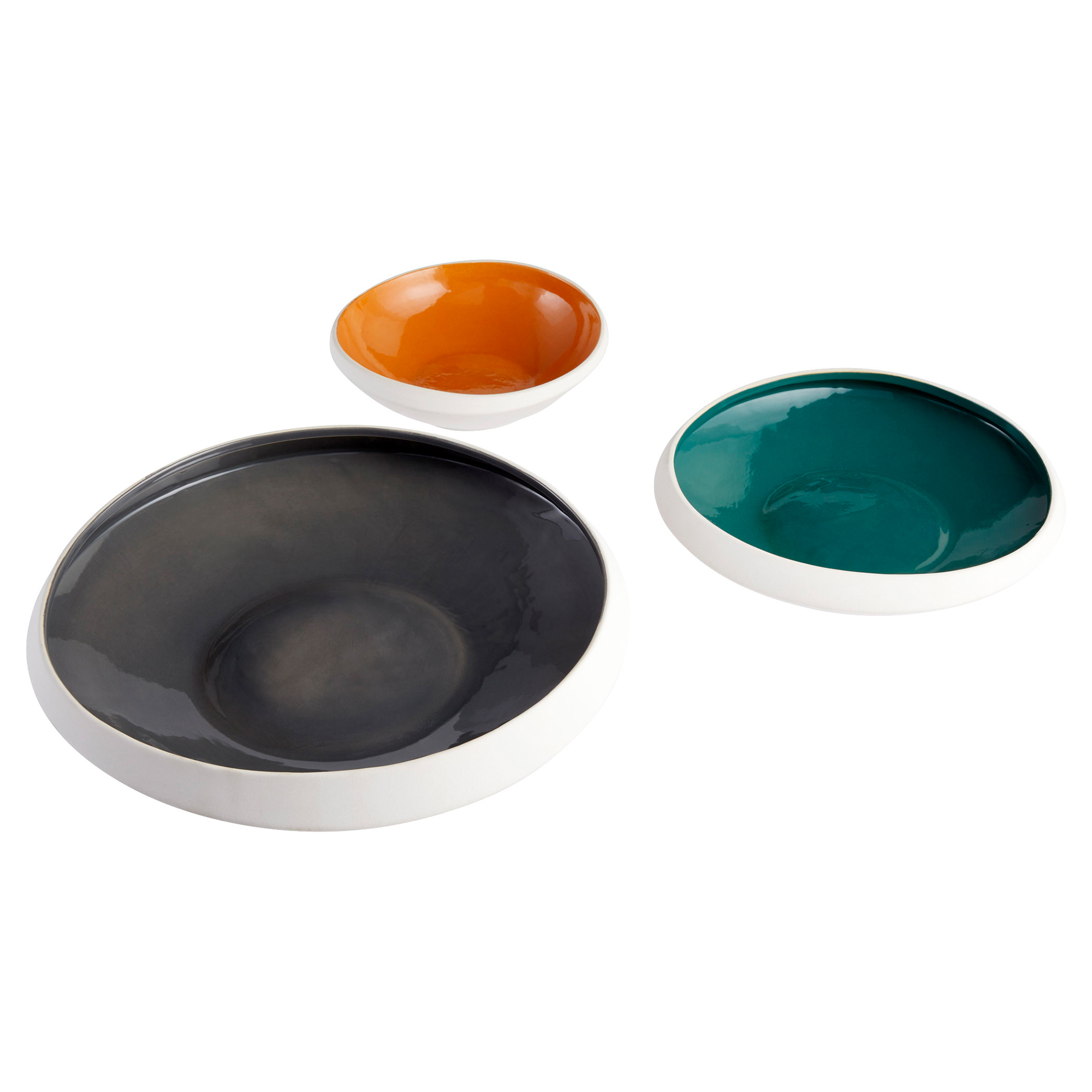 The Tricolore collection is a trio of ceramic bowls with a distinctive low nesting design. The exterior of these bowls features a rough textured matte white glaze finish, adding organic charm and tactile, while the interior is glazed in a choice of three vibrant hues: grey, teal, or orange. This bold pop of color not only adds visual interest but also complements a wide range of tablescapes and decor styles. With a round silhouette and asymmetrical rim, the Tricolore bowls represent a biotic contemporary styling. Whether grouped together in a vividly chromatic display or placed individually, the Tricolore bowls generate conversation and beckon attention.