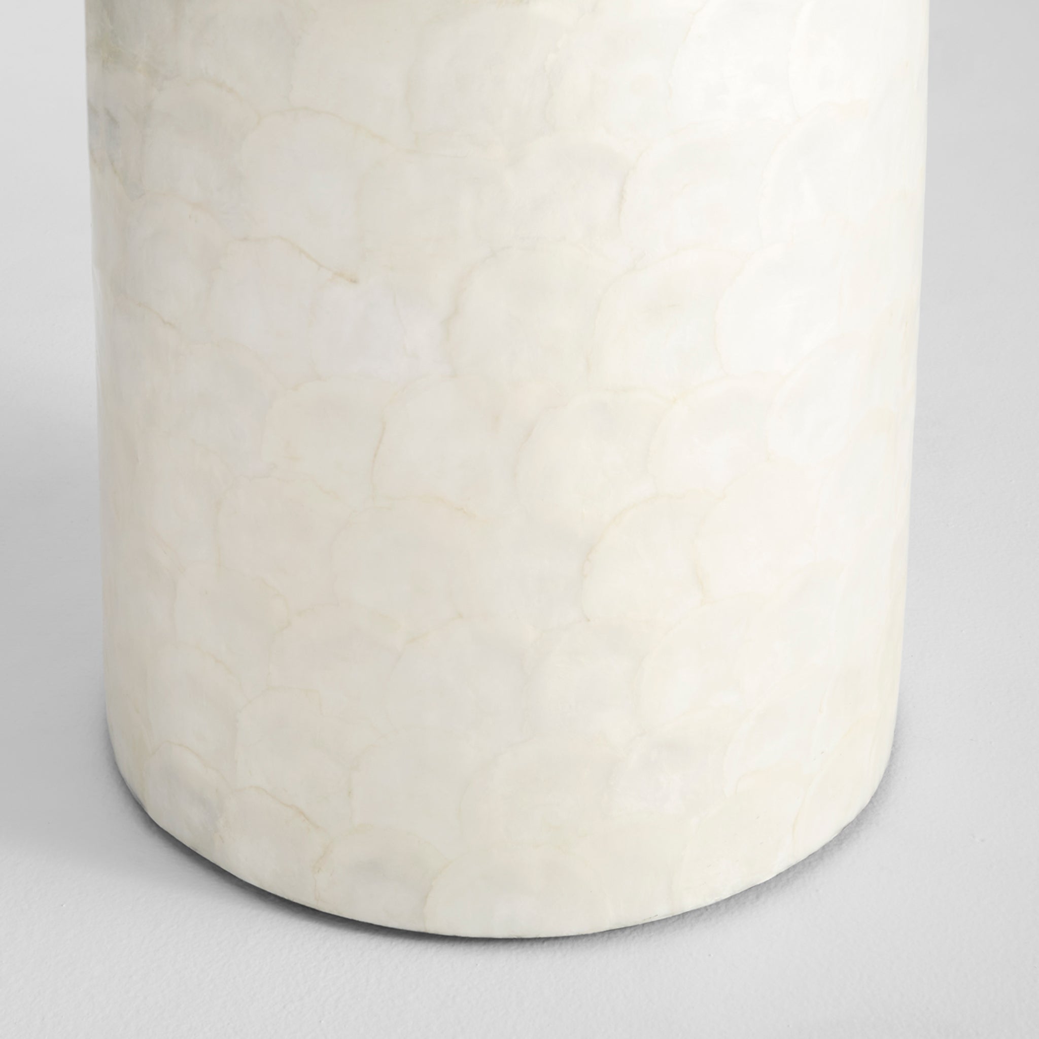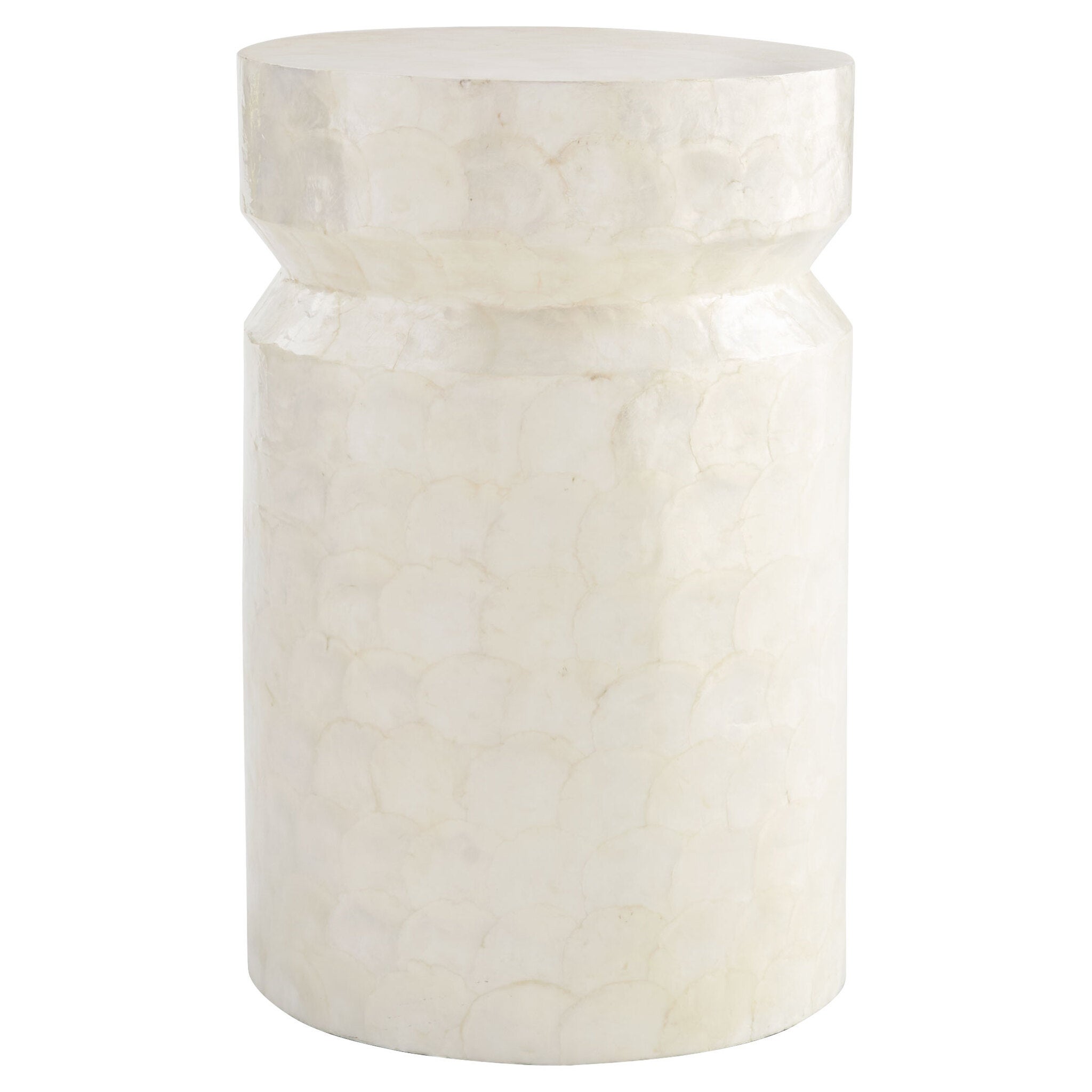 The Triton collection features the centuries old, enduring beauty of the capiz shell. Harvested from sea mollusks native to Southeast Asia, the capiz shells are delicately laminated before they are fixed to a cylindrical fiberglass frame. Natural tones of pearl white and taupe in the capiz shell add a subtle iridescence. The Triton side tables are available in two colorways. Display your favorite sculpture on top of the Triton side table in an entryway, office or in a lobby.