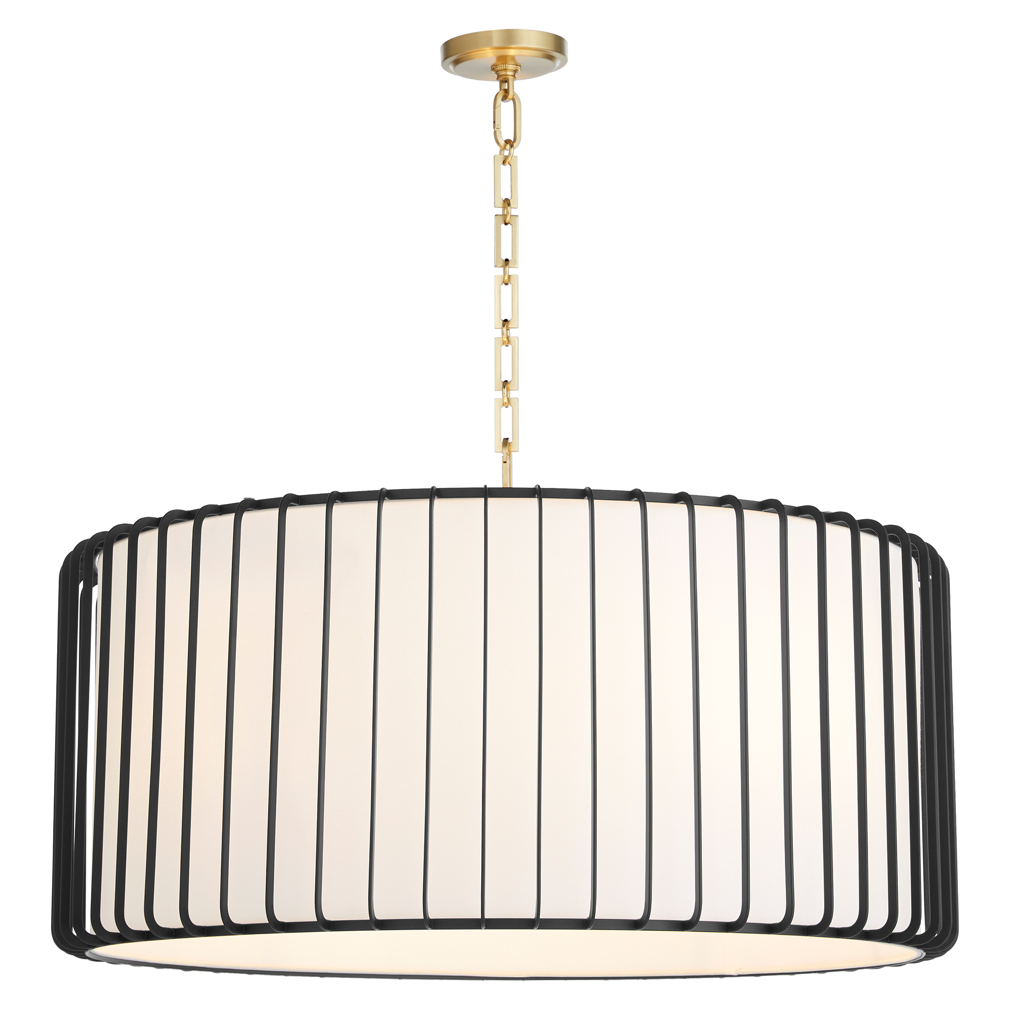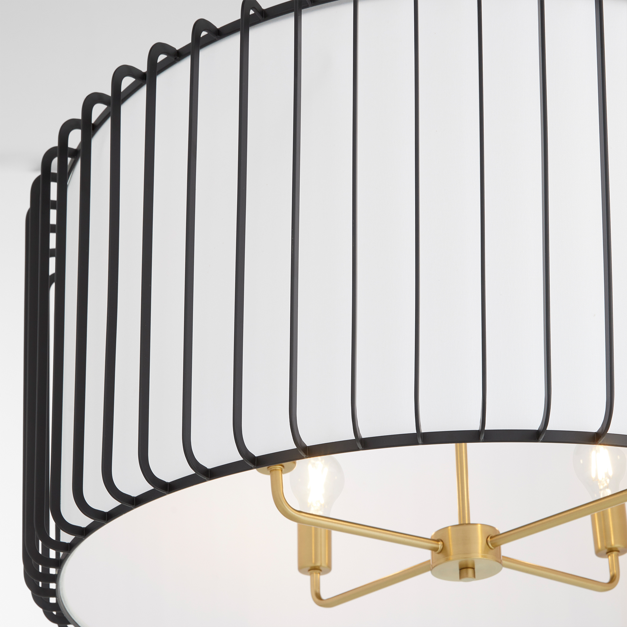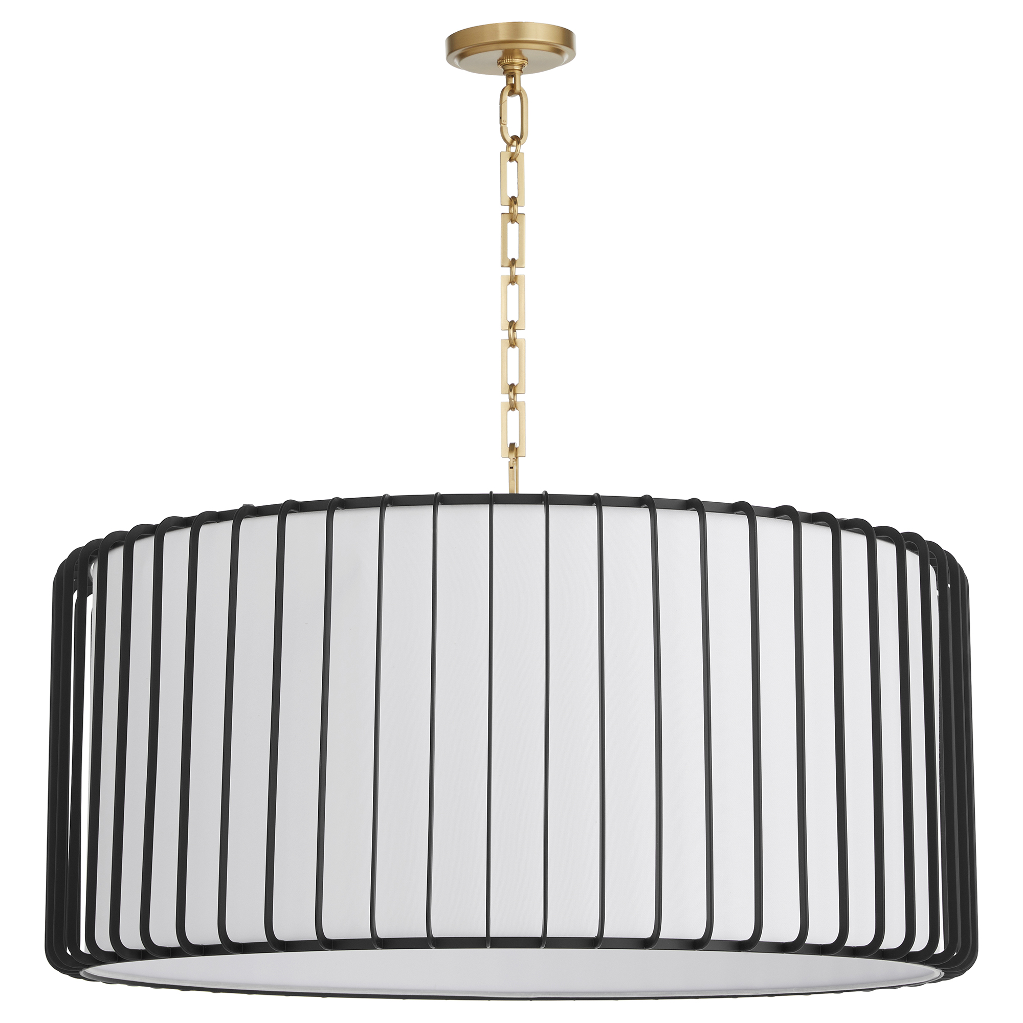 The shades in the Tuxedo lighting collection feature a unique design, with fans that gracefully curve into the frame, adding dimensionality and visual interest. A decorative brass-finished chain suspends the fixture and contrasts the black frame. Wrapped in a white fabric drum shade, the soft glow of light is beautifully diffused, creating a warm and inviting ambiance. Attention to detail is evident in every aspect of the collection’s design, from the little brass pin that securely holds in the top diffuser to the overall craftsmanship that ensures a flawless finish. Damp-listed for versatility, the Tuxedo Lighting Collection is suitable for a variety of indoor settings. With options of 1, 3, or 4 lights, these fixtures provide ample illumination for any space. The included 8-foot chain and one 12-inch rod offer flexibility in installation, making them adaptable to vaulted and sloped ceilings. Elevate your design with the Tuxedo Lighting Collection and bask in timeless beauty and functionality.