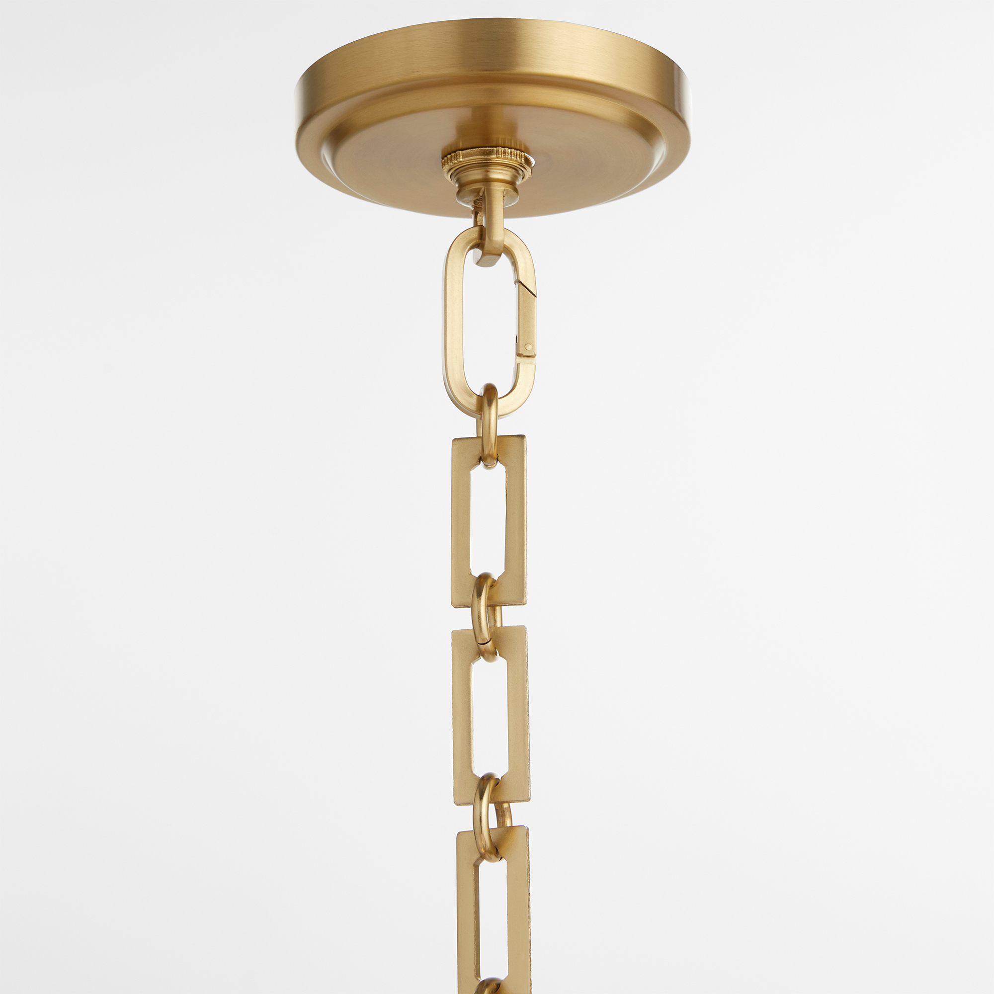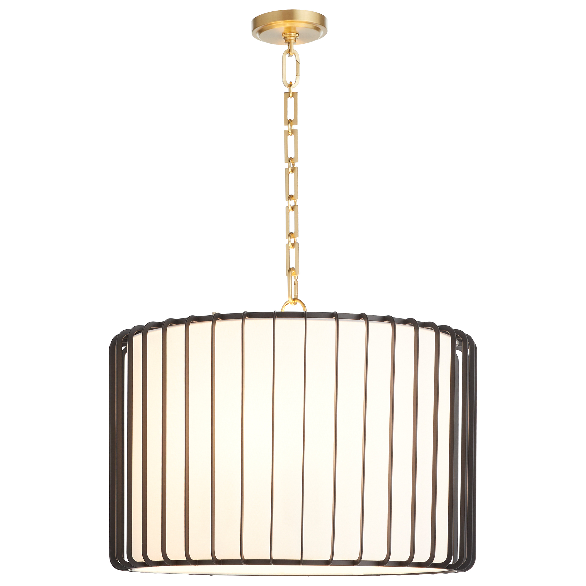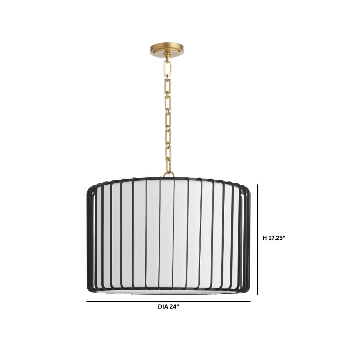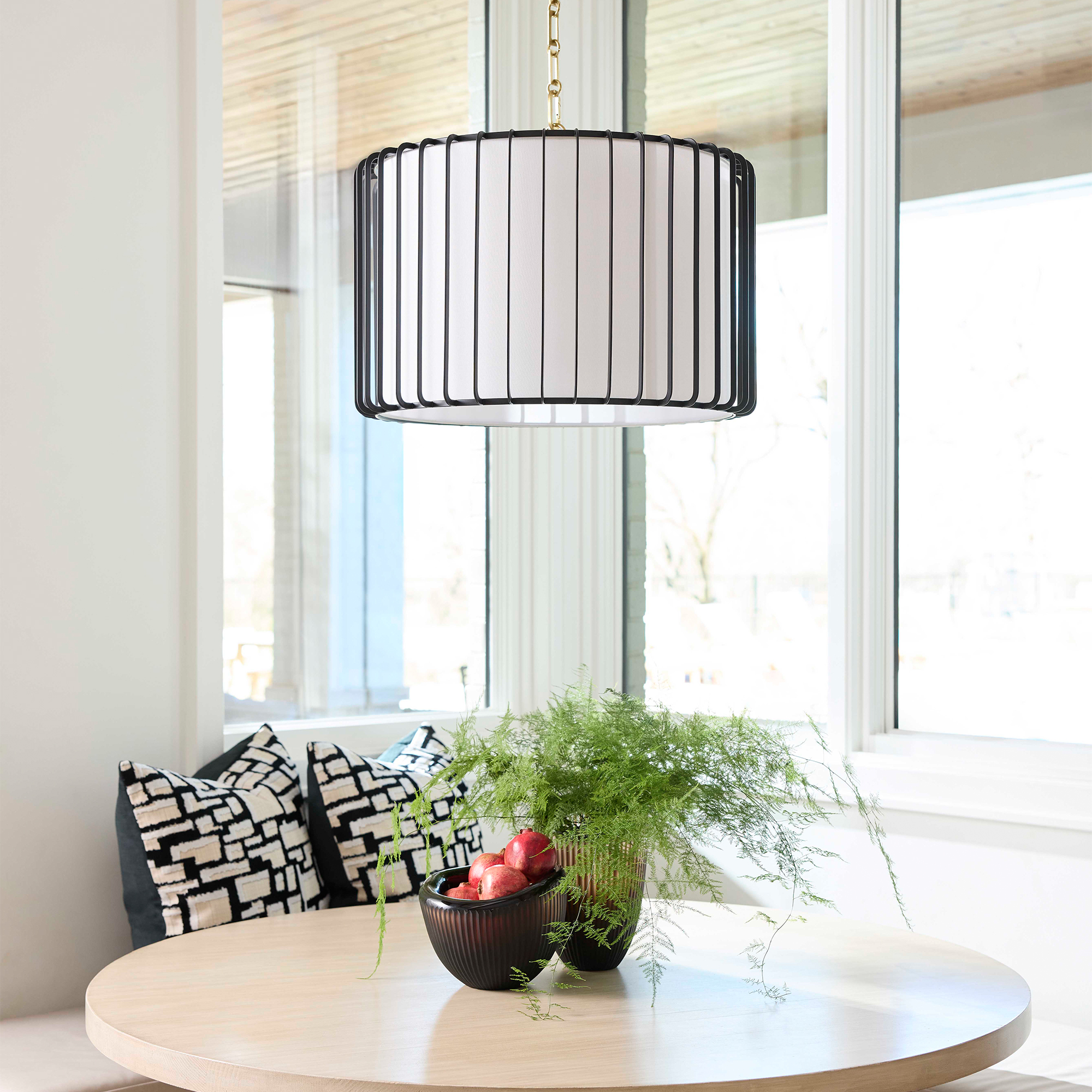 The shades in the Tuxedo lighting collection feature a unique design, with fans that gracefully curve into the frame, adding dimensionality and visual interest. A decorative brass-finished chain suspends the fixture and contrasts the black frame. Wrapped in a white fabric drum shade, the soft glow of light is beautifully diffused, creating a warm and inviting ambiance. Attention to detail is evident in every aspect of the collection’s design, from the little brass pin that securely holds in the top diffuser to the overall craftsmanship that ensures a flawless finish. Damp-listed for versatility, the Tuxedo Lighting Collection is suitable for a variety of indoor settings. With options of 1, 3, or 4 lights, these fixtures provide ample illumination for any space. The included 8-foot chain and one 12-inch rod offer flexibility in installation, making them adaptable to vaulted and sloped ceilings. Elevate your design with the Tuxedo Lighting Collection and bask in timeless beauty and functionality.