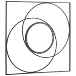 “Fusing function and fashion, this geometric accent mirror offers a useful reflection while providing a head-turning focal point for any ensemble. The frames graphite finish sports to overlapping circles enclosed within a rectangular frame. The reflective glass mirror is nestled in the center within another loop. The iron design is formed into a scaled-up wall accent that will provide your entryway, living room, or bedroom designs some statement-making appeal.”
