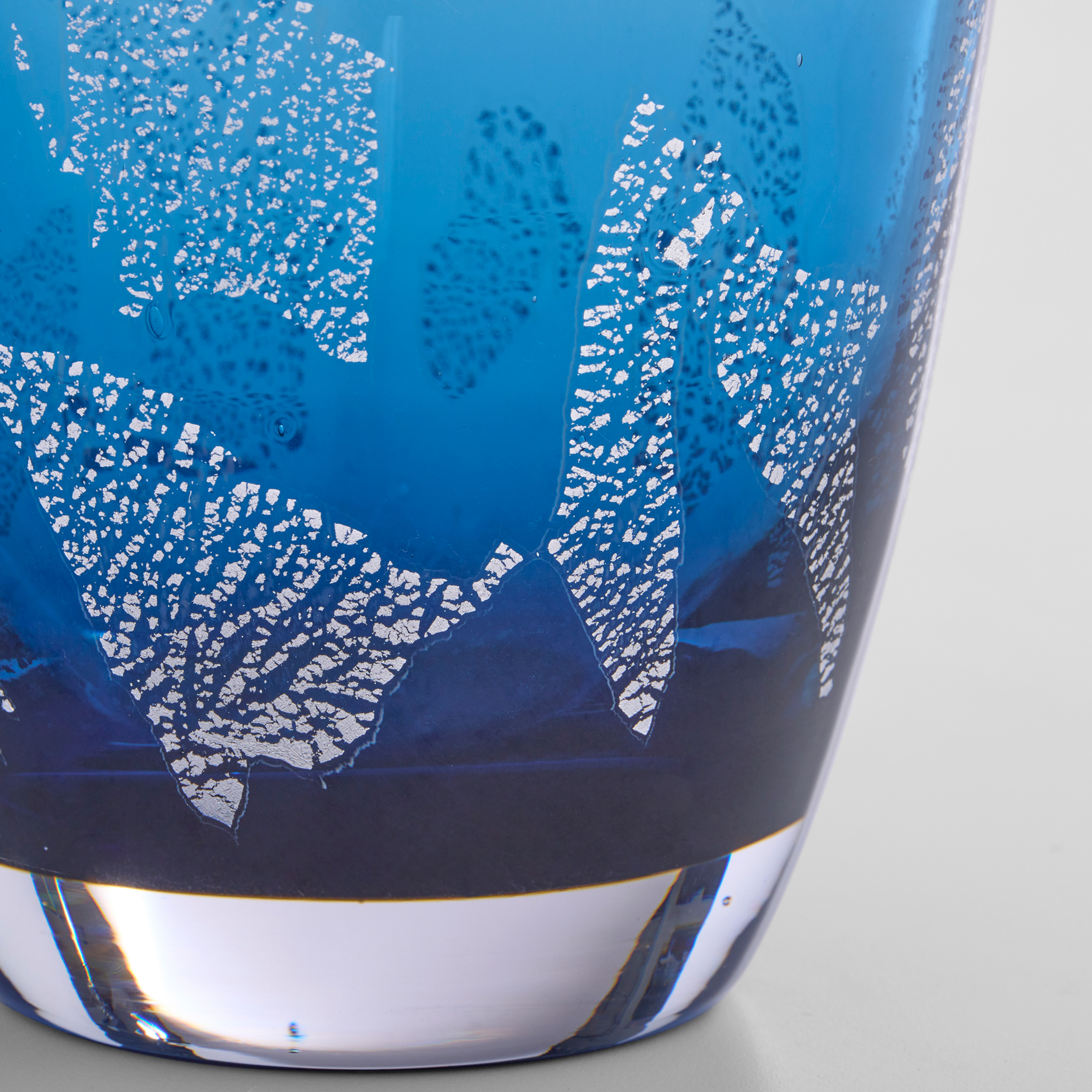 The Vero vases showcase a long, stretched-neck shape with an ocean blue color deepening towards the bulb. A clear glass base provides a contrasting foundation for the vibrant, blown layers with swirled gold glass details. Each vase is a unique creation, showcasing the artistry of these striking vases. Available in two separate sizes.