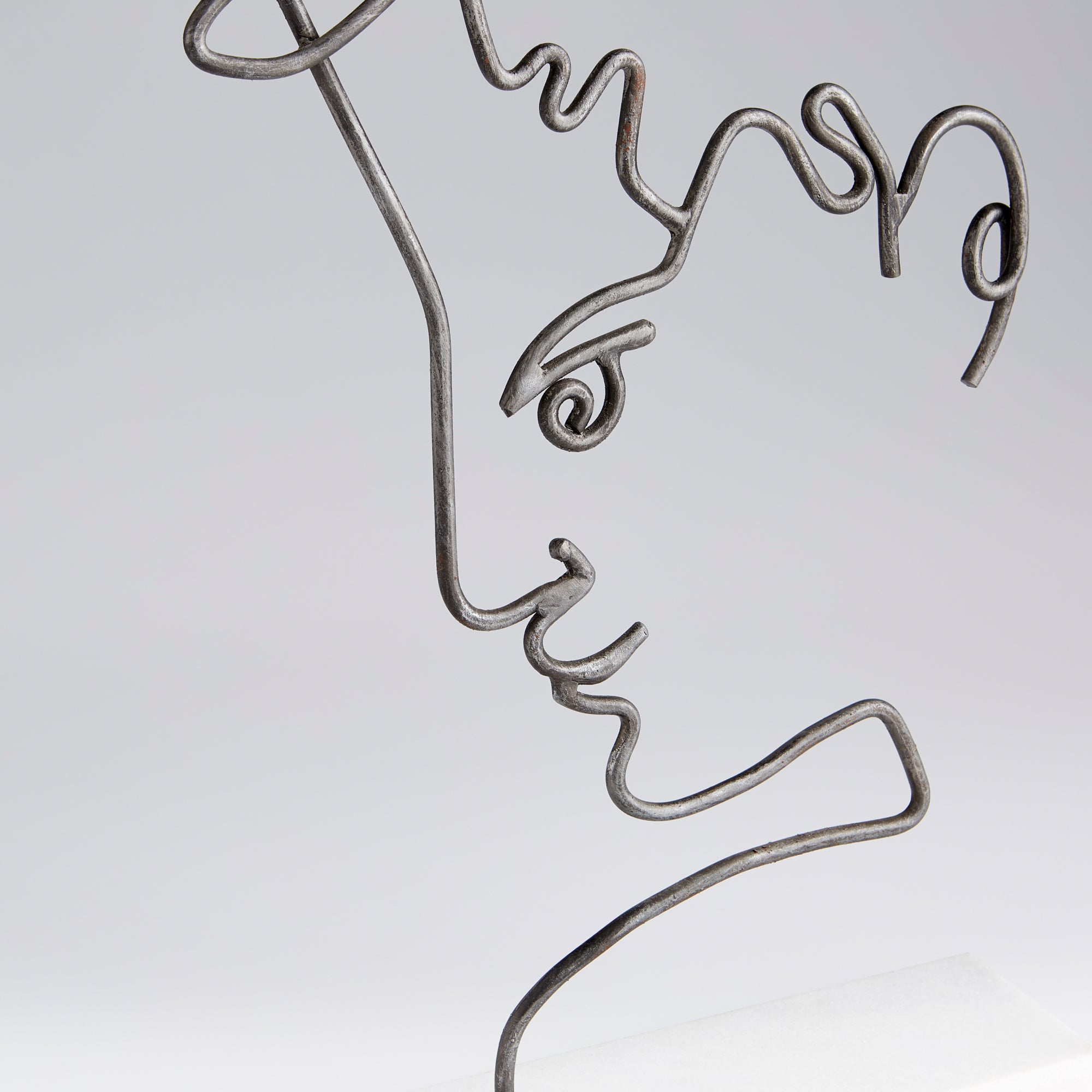 This profile of a human face is composed entirely of iron in a whimsical and abstract pattern. The expressive accent is perched atop a rectangular, solid granite base. The contrasting gray and white finishes help this sculpture stand out, making it a great addition to any office shelf display, coffee table design, or commercial lobby styling.