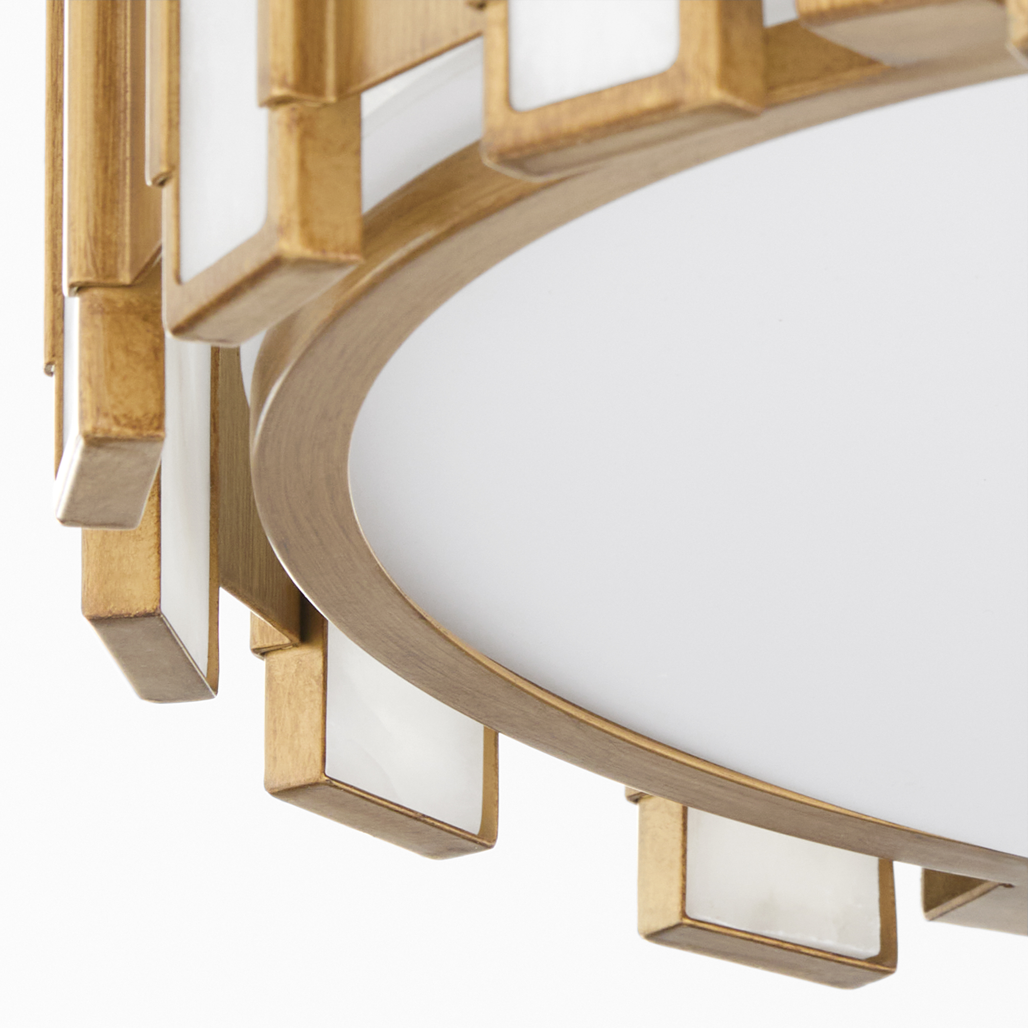 The Volterra collection comprises alternating short, aged brass and tall, framed alabaster glass rectangles that meet around medium base sockets to form a cylindrical shade. Concealed within, the lamps cast a soft glow through a round frosted glass diffuser secured to the light by an aged brass frame. Add mid-century, empire style with the Volterra collection of designer lighting to your next interior design project.