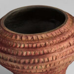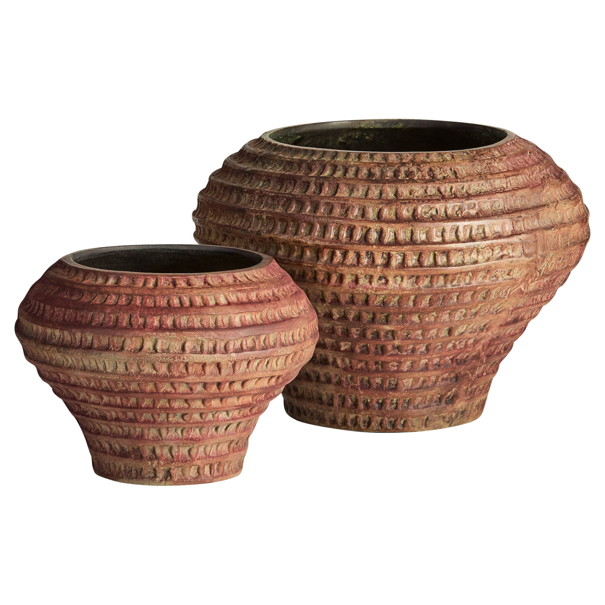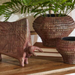 The Yucca Vase, crafted from cast aluminum, boasts a warm antique ochre finish that infuses rustic charm into any space. Its eye-catching horizontal ribbed design makes it a stunning accent piece.