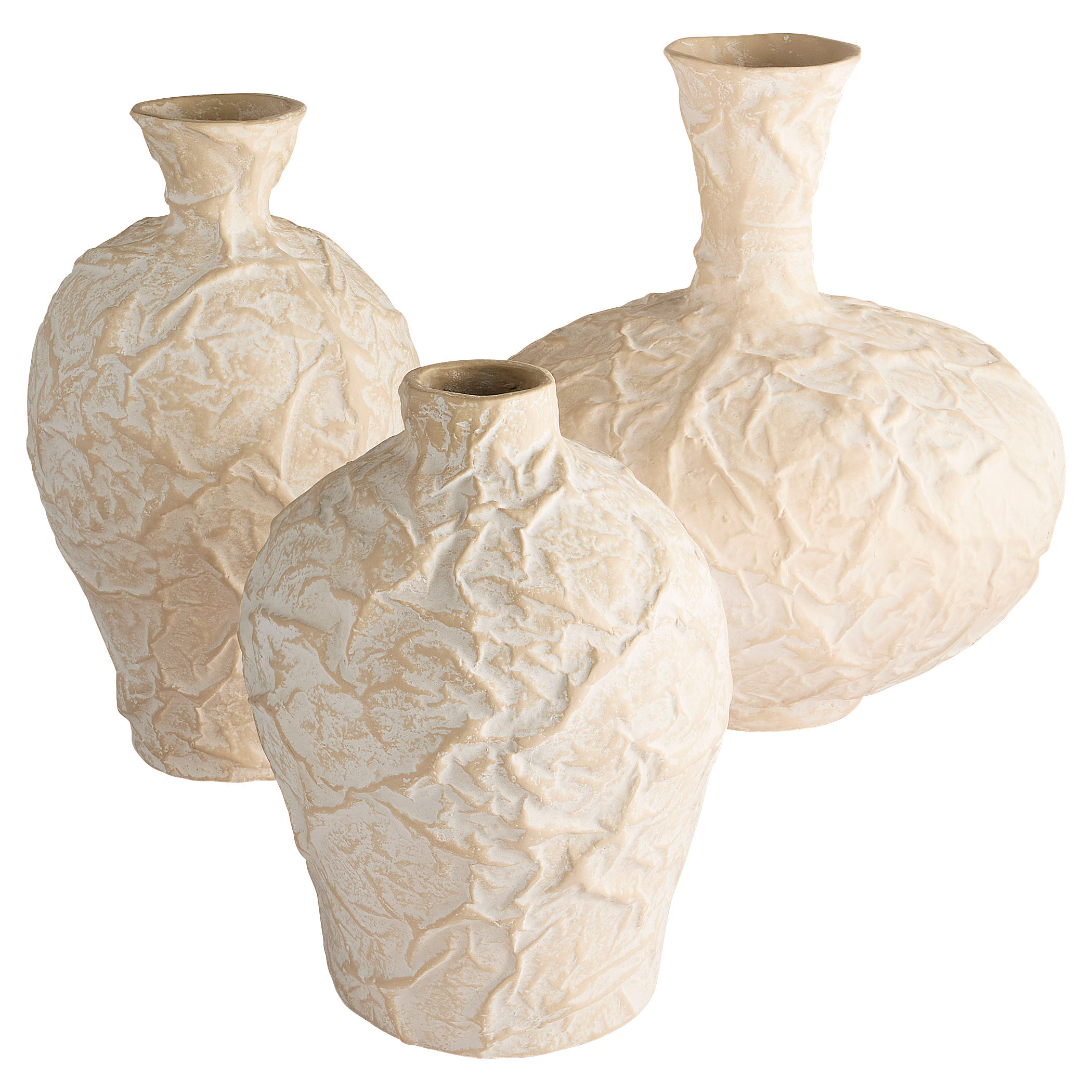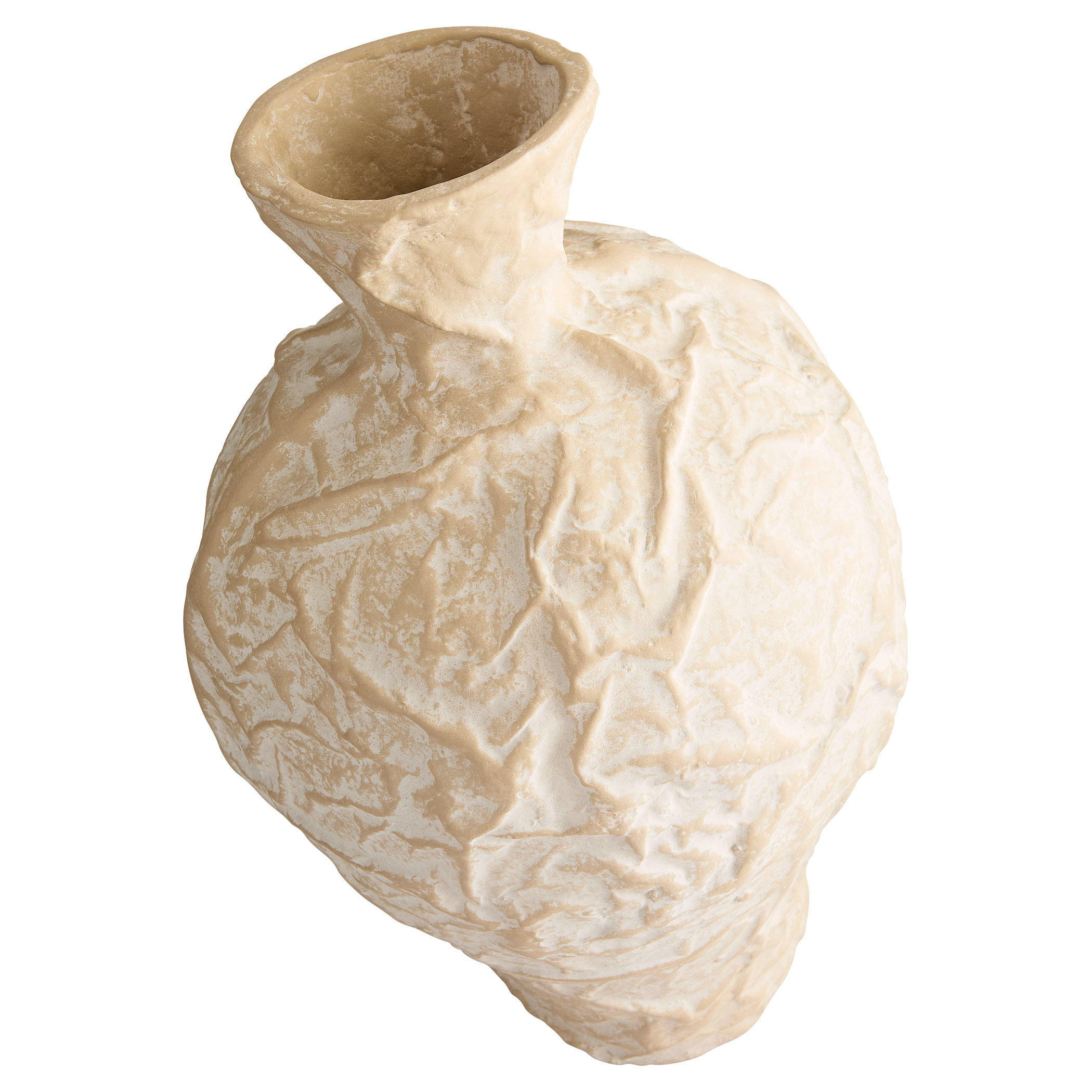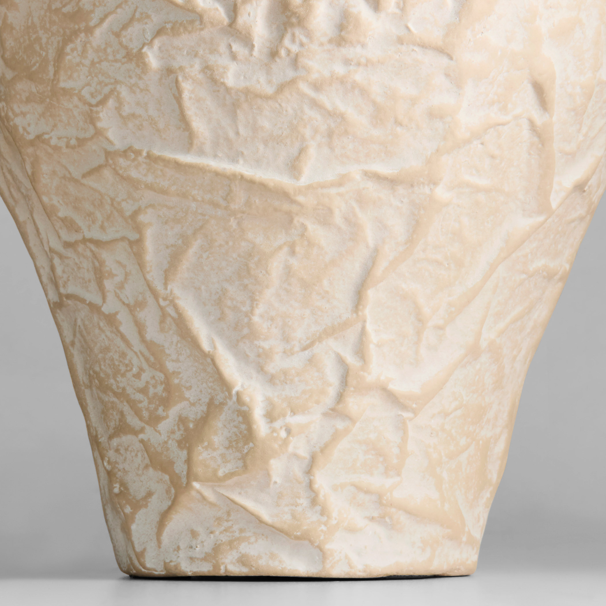 Inspired by the art of crumpling materials to create shapes and textures, artisans apply antiquing details by hand to the raised sections of the Zimurtu vases, creating deep contrast. Their large scale commands attention whether displayed individually or clustered in groups, making them perfect statement pieces. Made from Ecomix, a biodegradable, eco-friendly material.