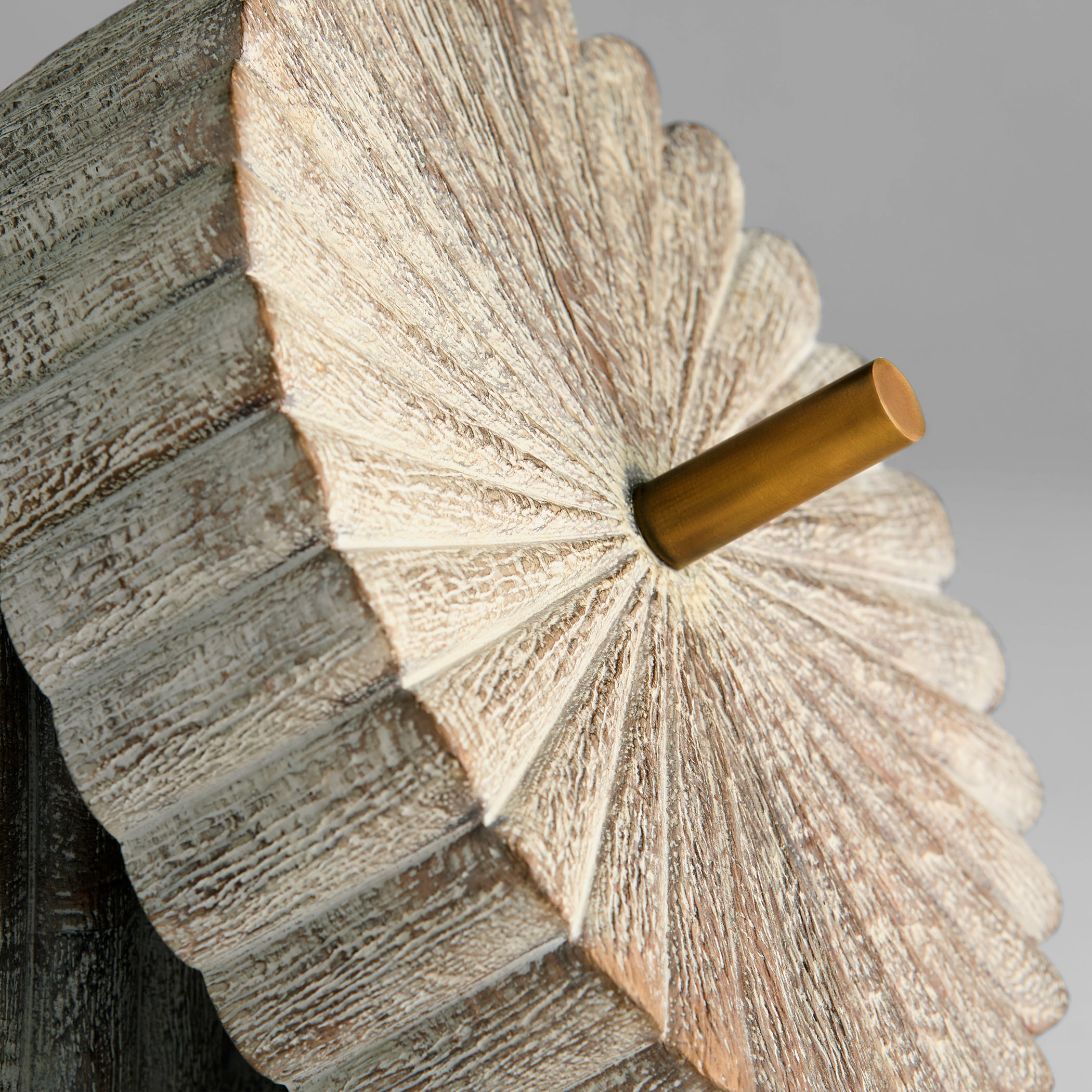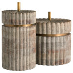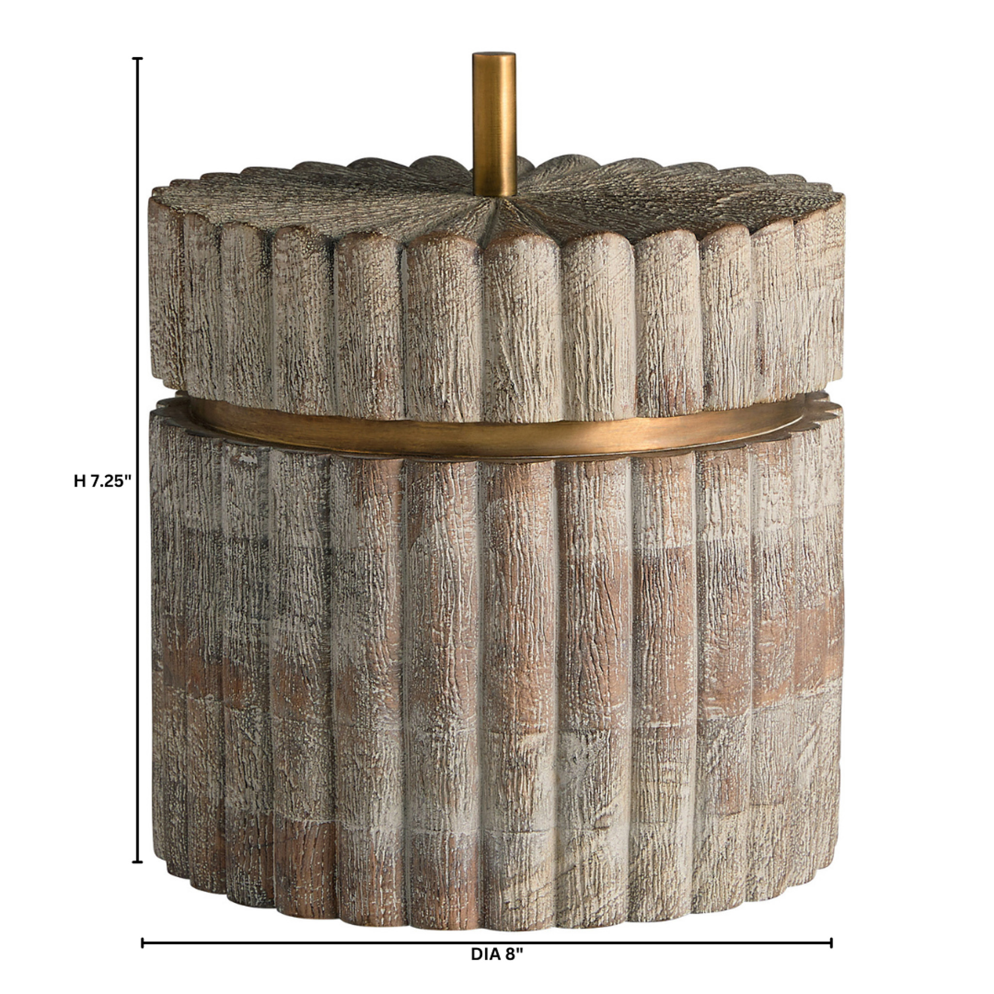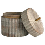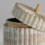 Zucca Box’s scalloped design creates depth and visual interest in the texture of the hand-carved Ardu wood. The cylindrical brass knob on the removable lidJuxtaposes smooth brass with the distressed taupe-finished wood. An inset brass band is revealed where the lid meets the box.